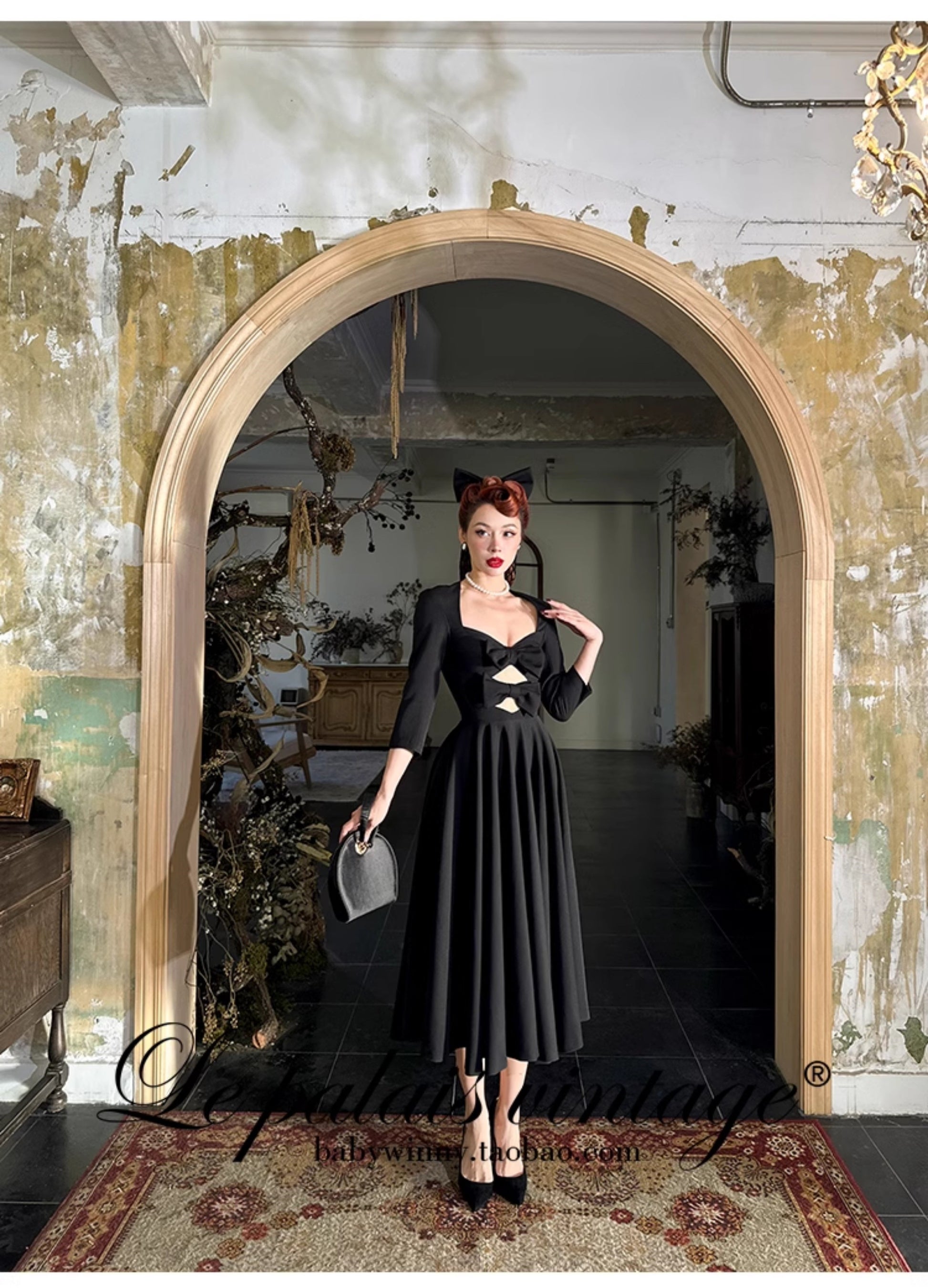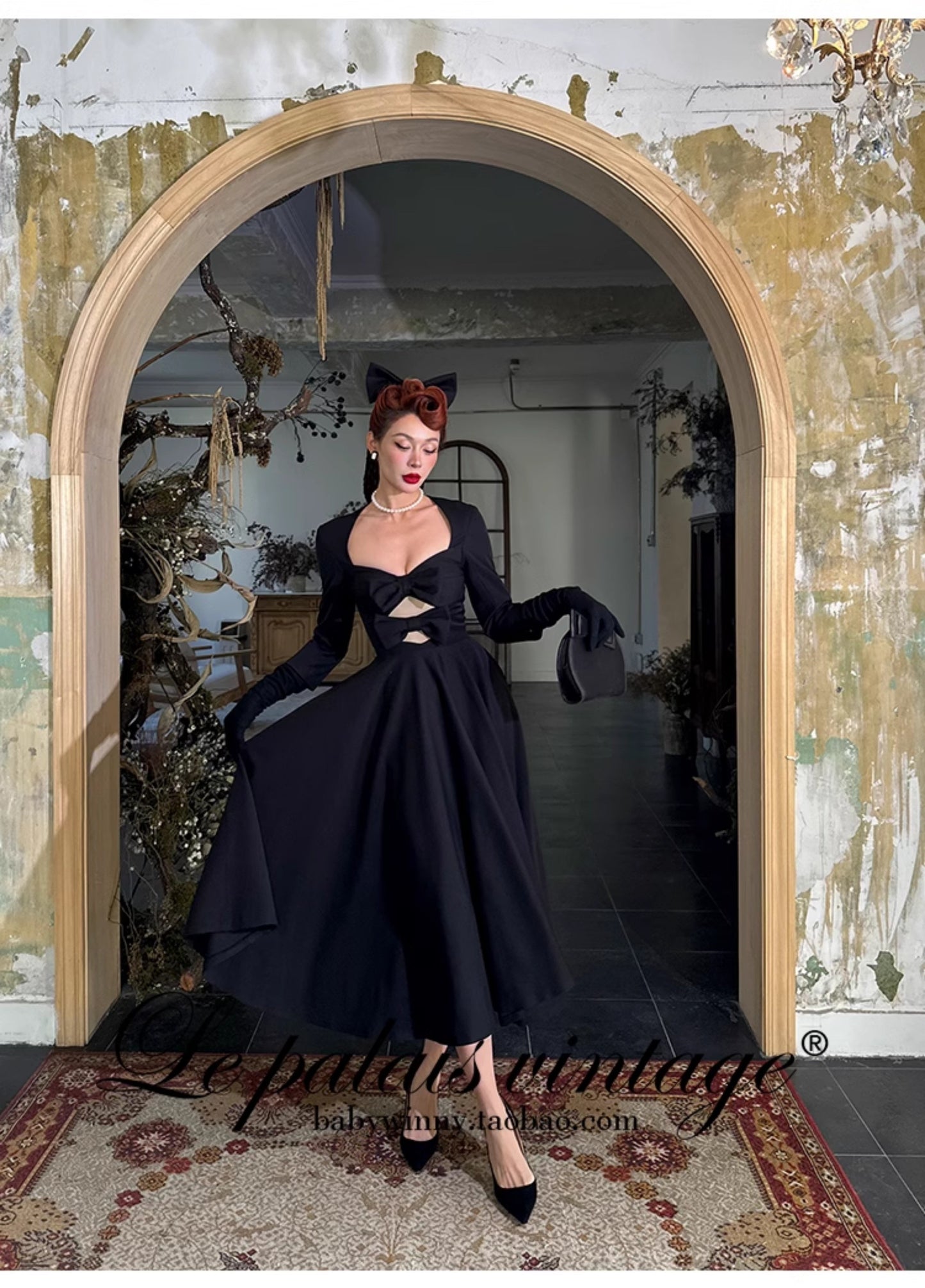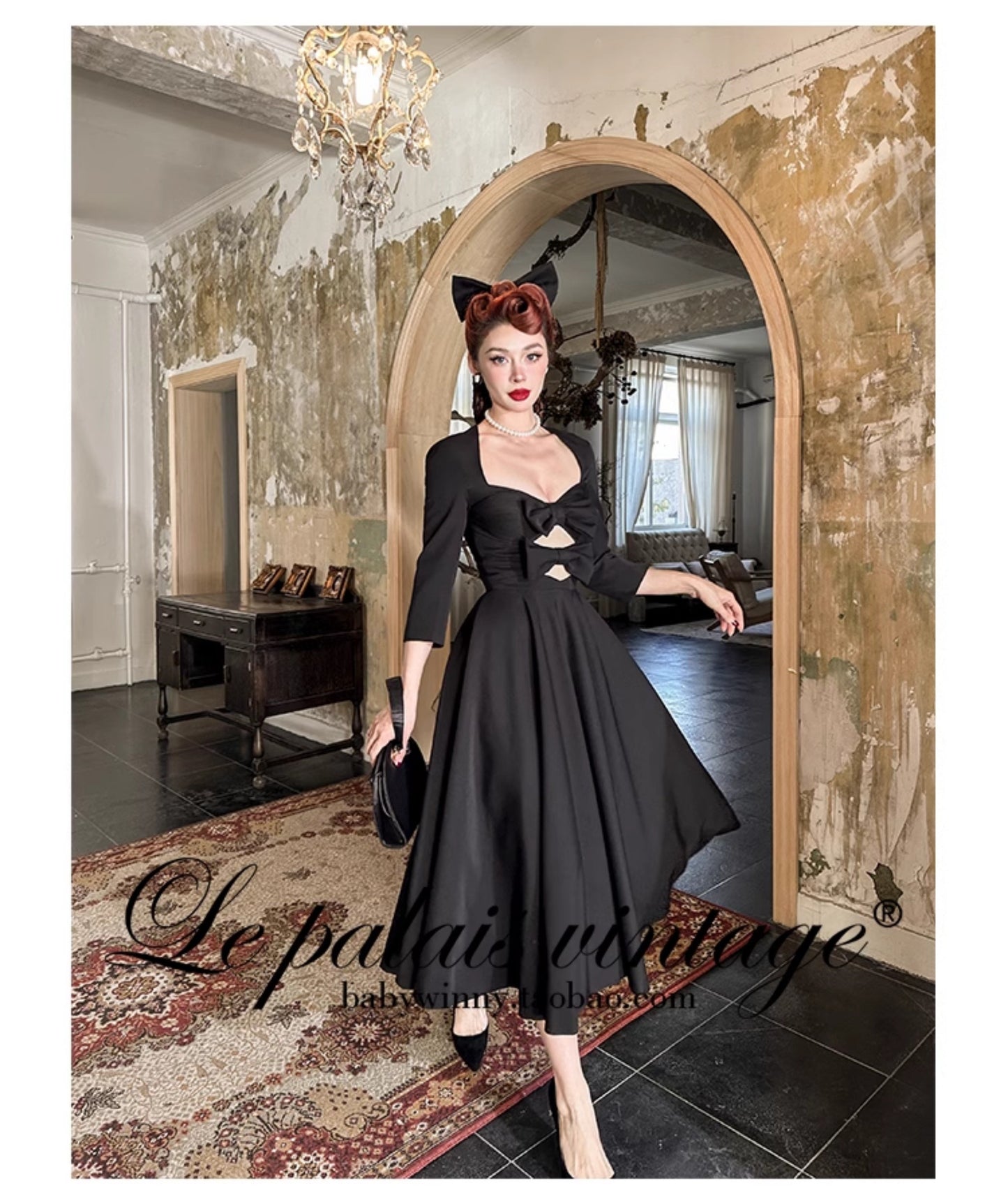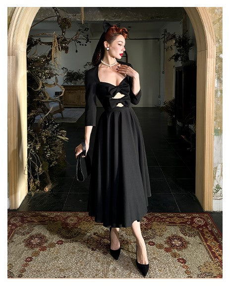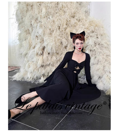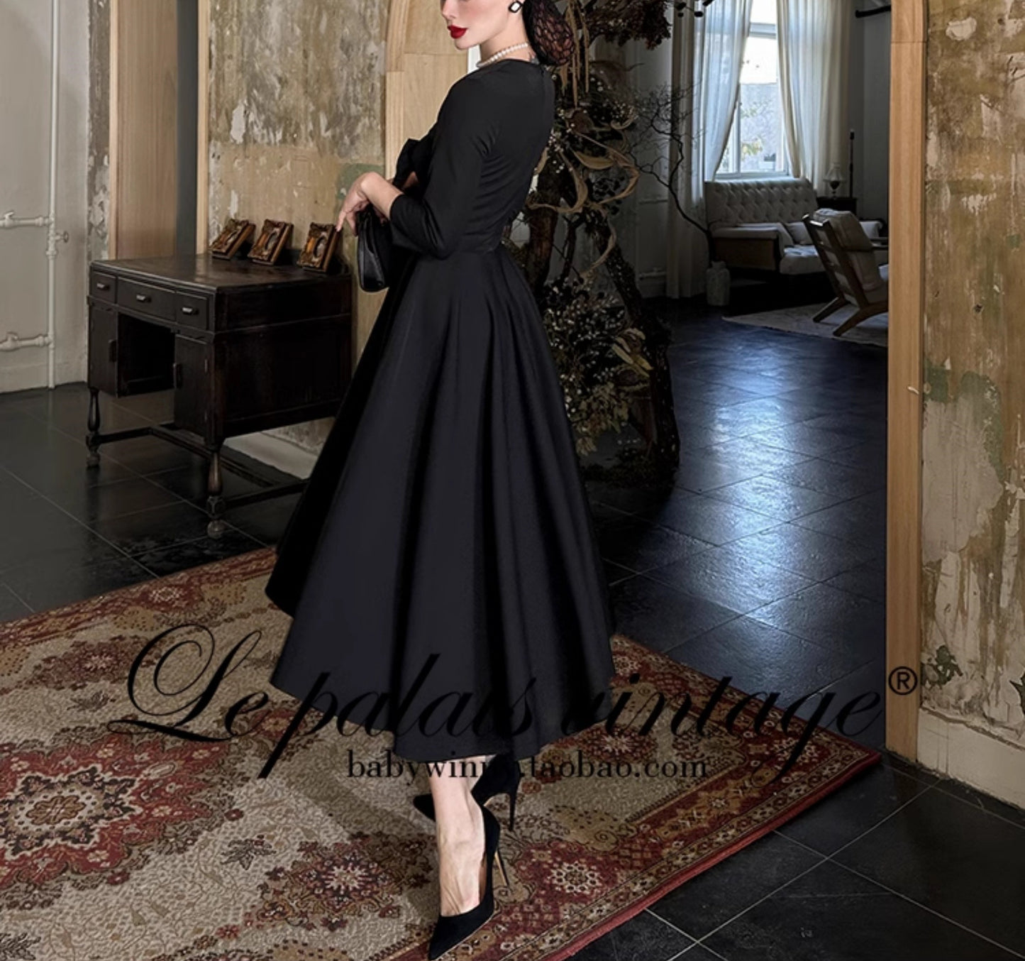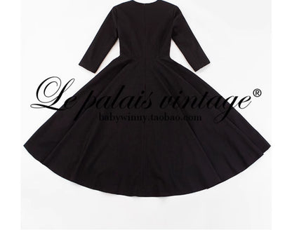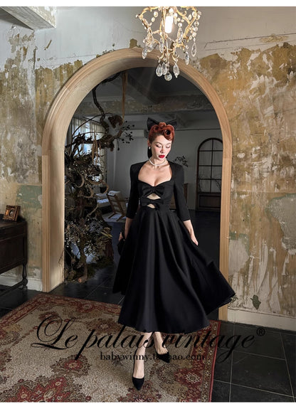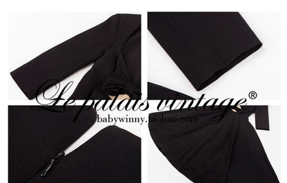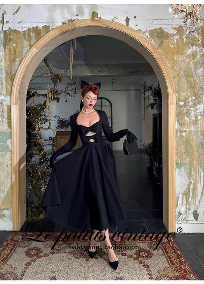 Le Palais Vintage Elegant Retro Long Sleeves Midi black Cocktail Dress-Aurora