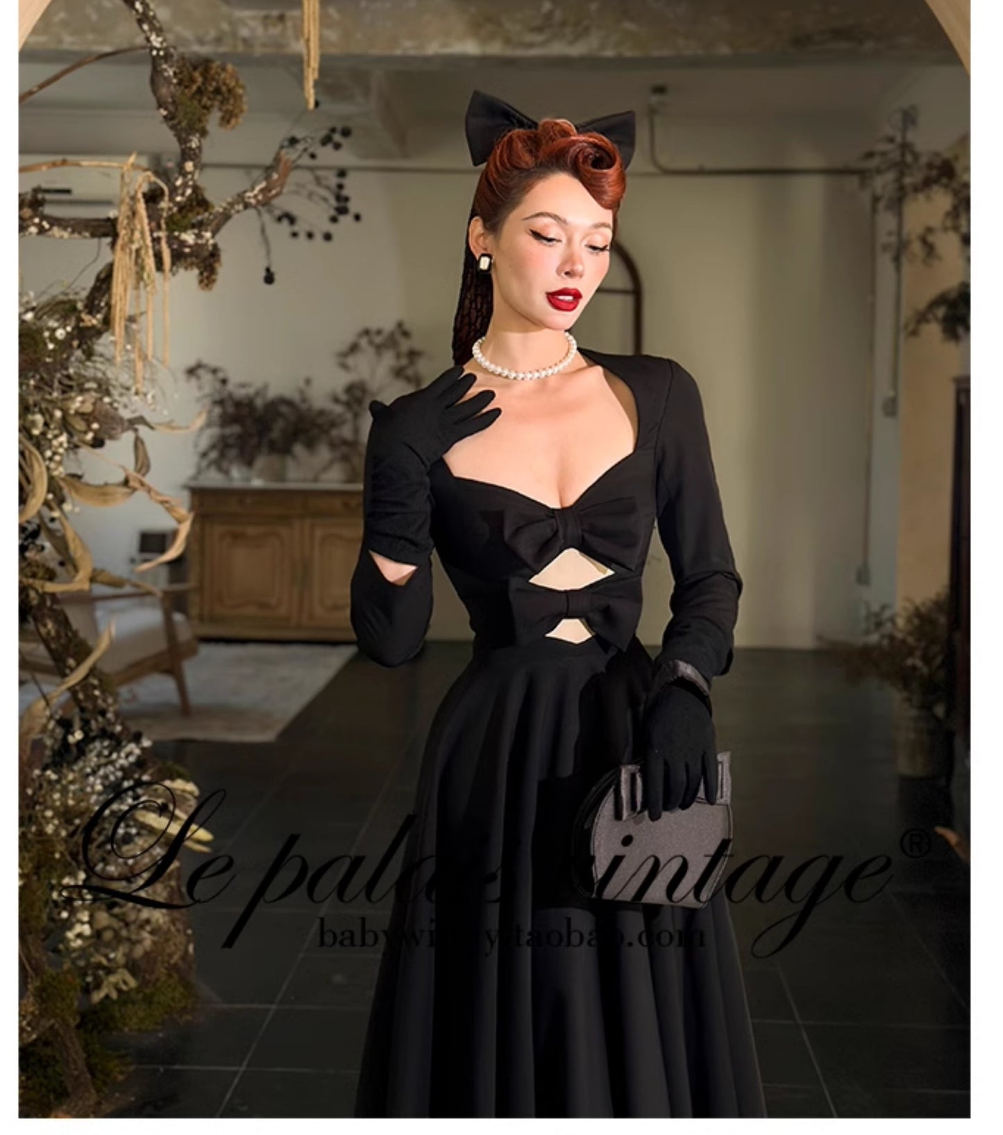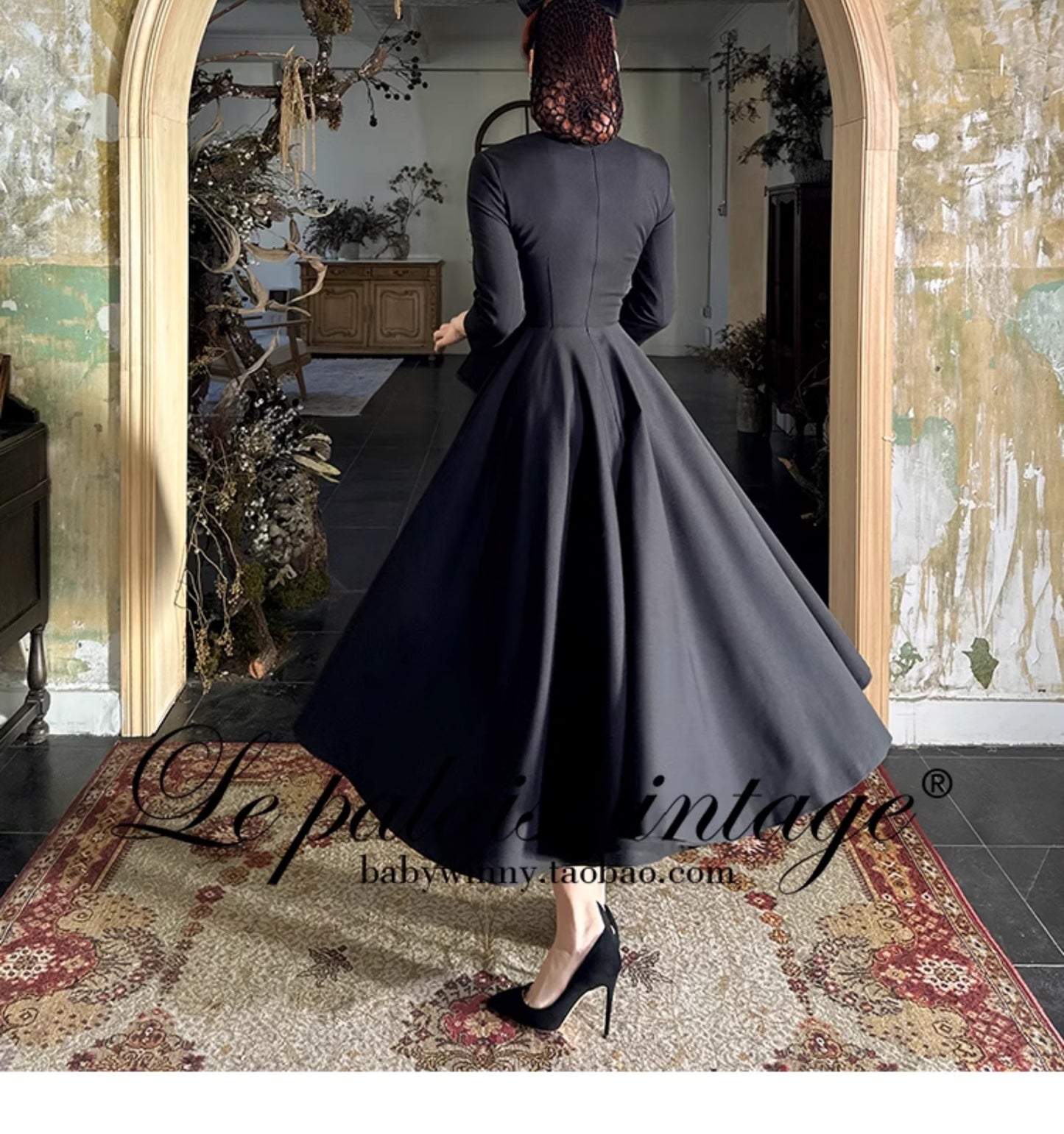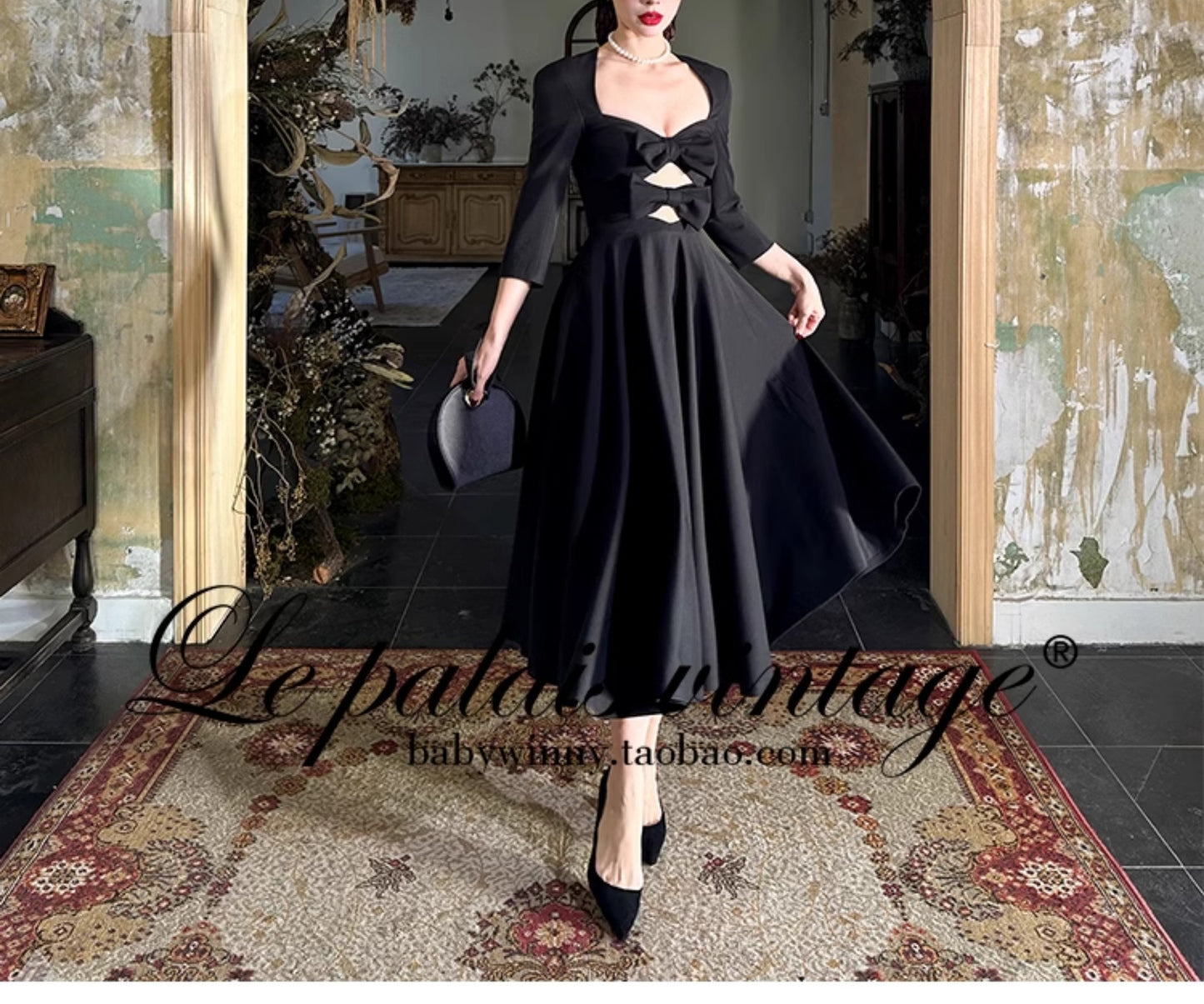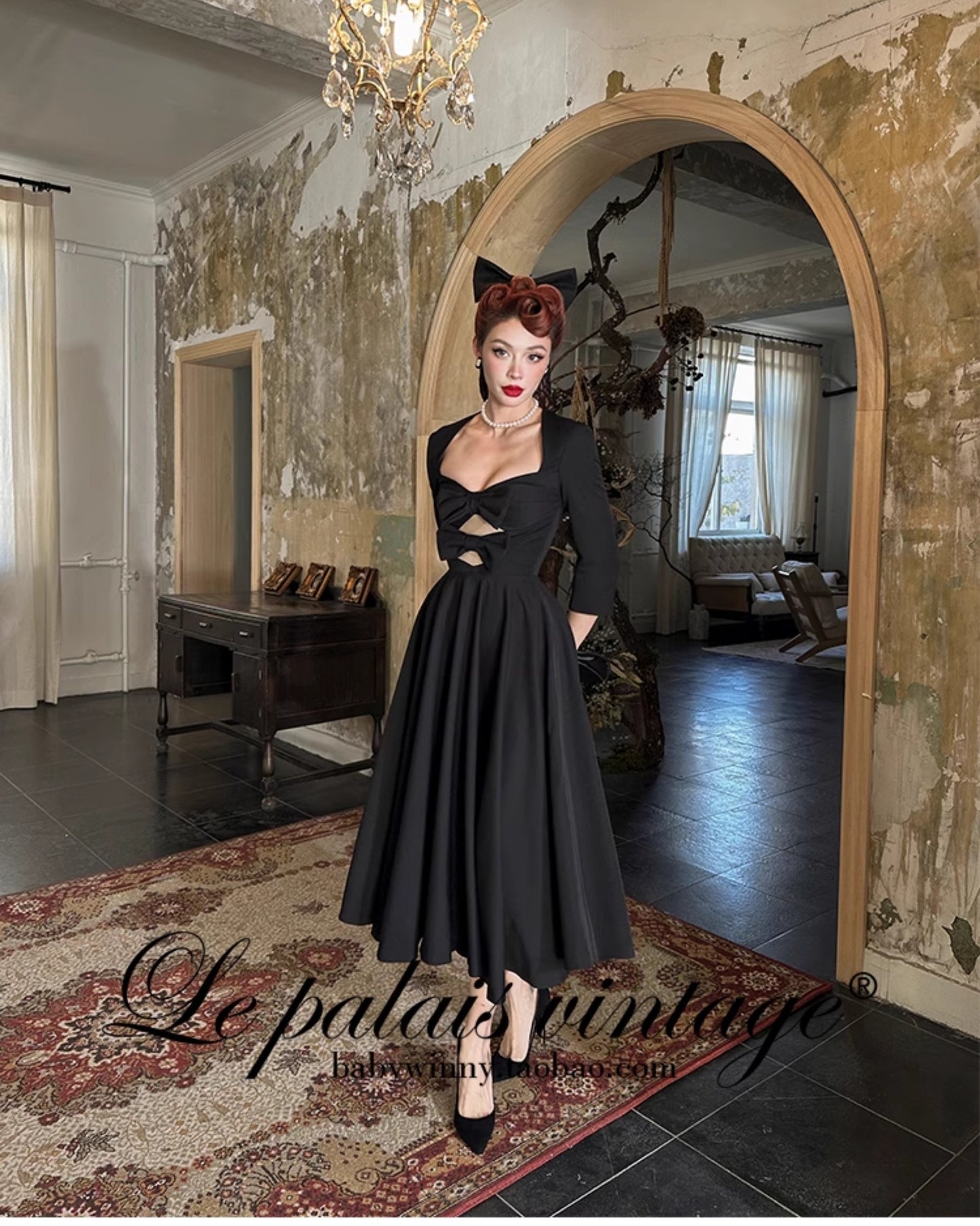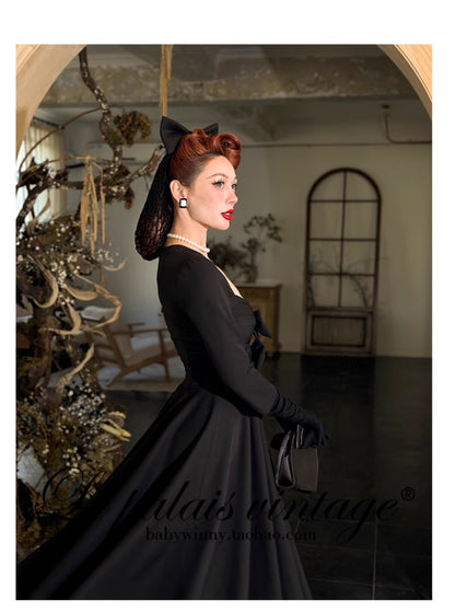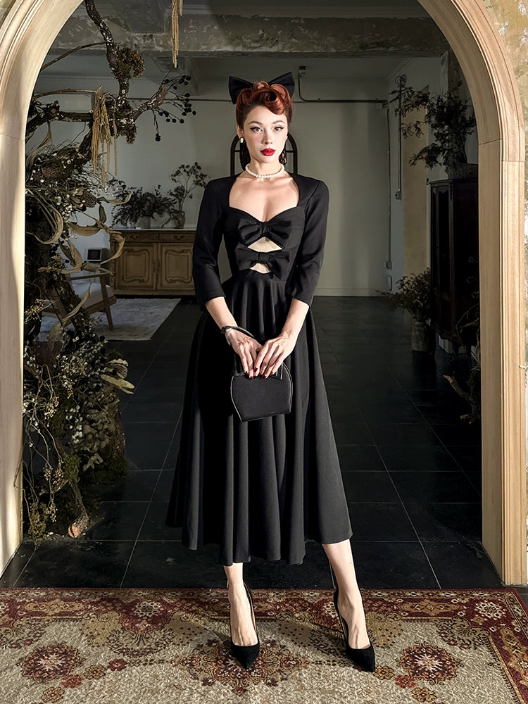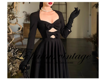 Le Palais Vintage Elegant Retro Long Sleeves Midi black Cocktail Dress-Aurora