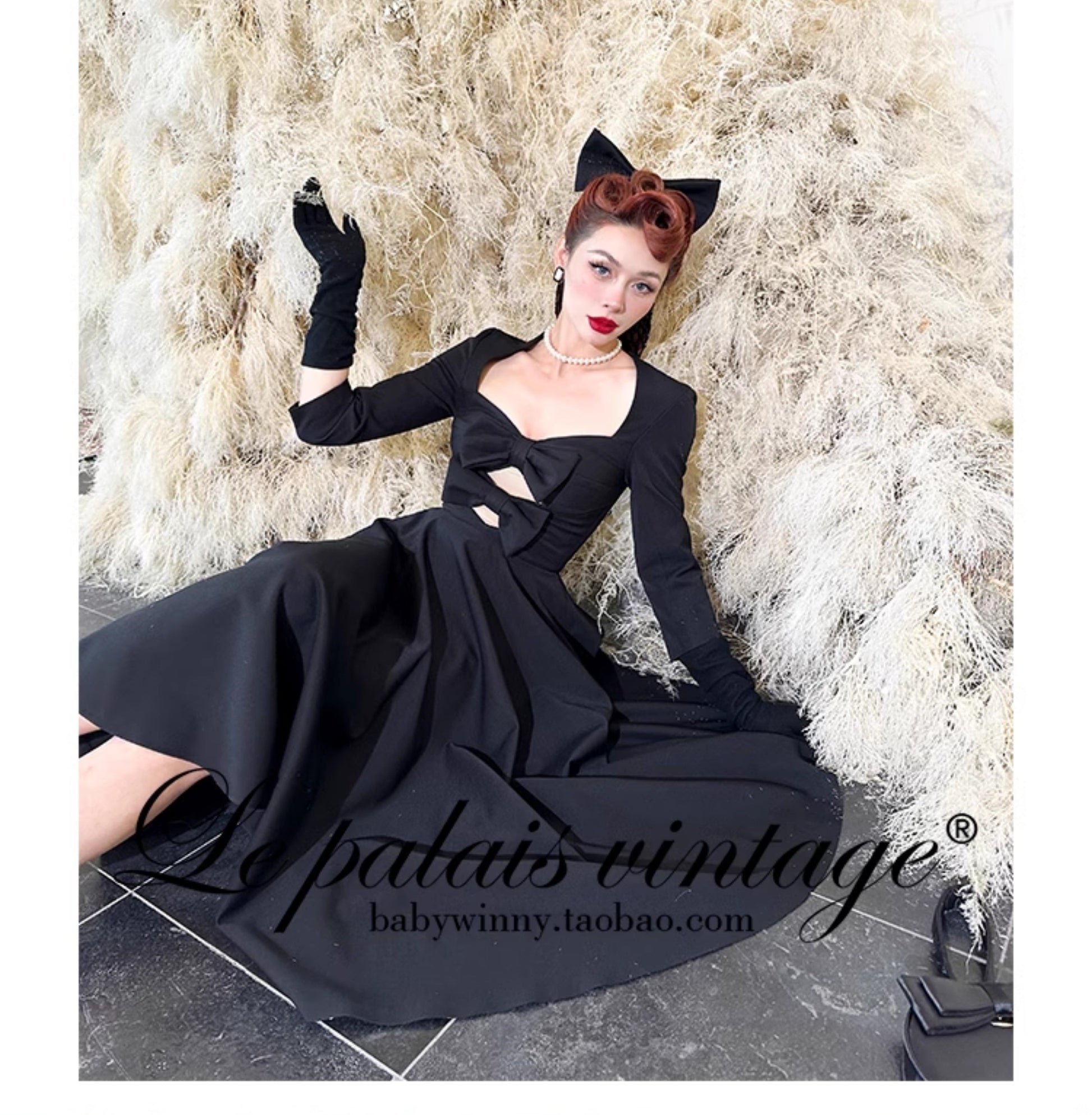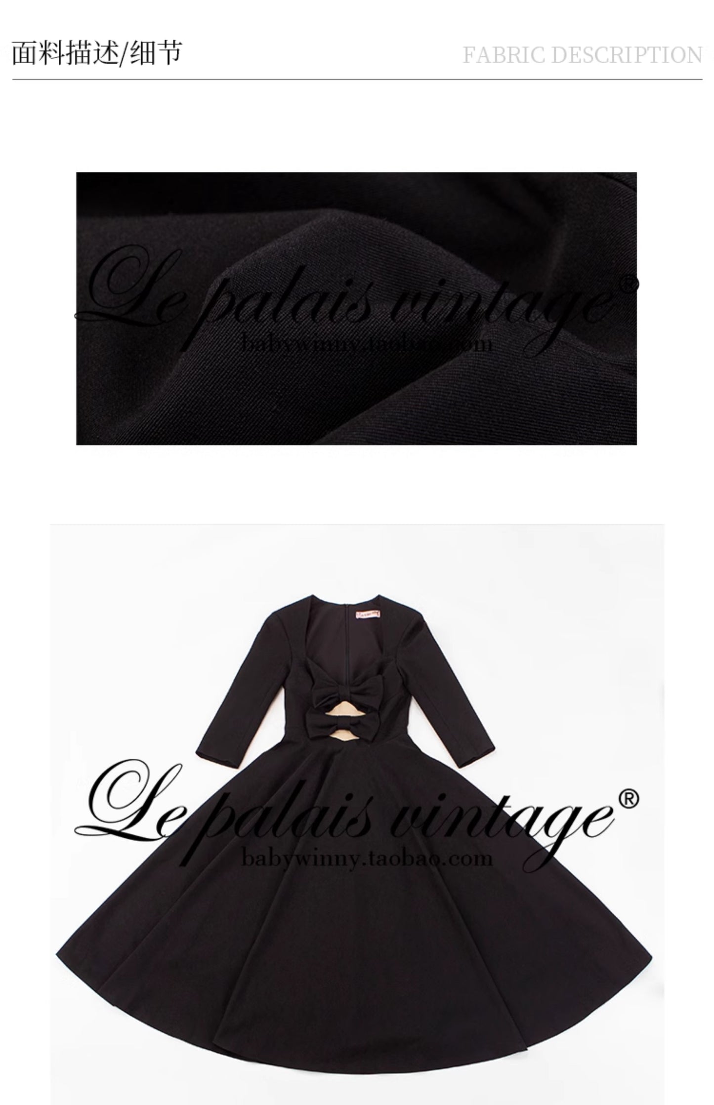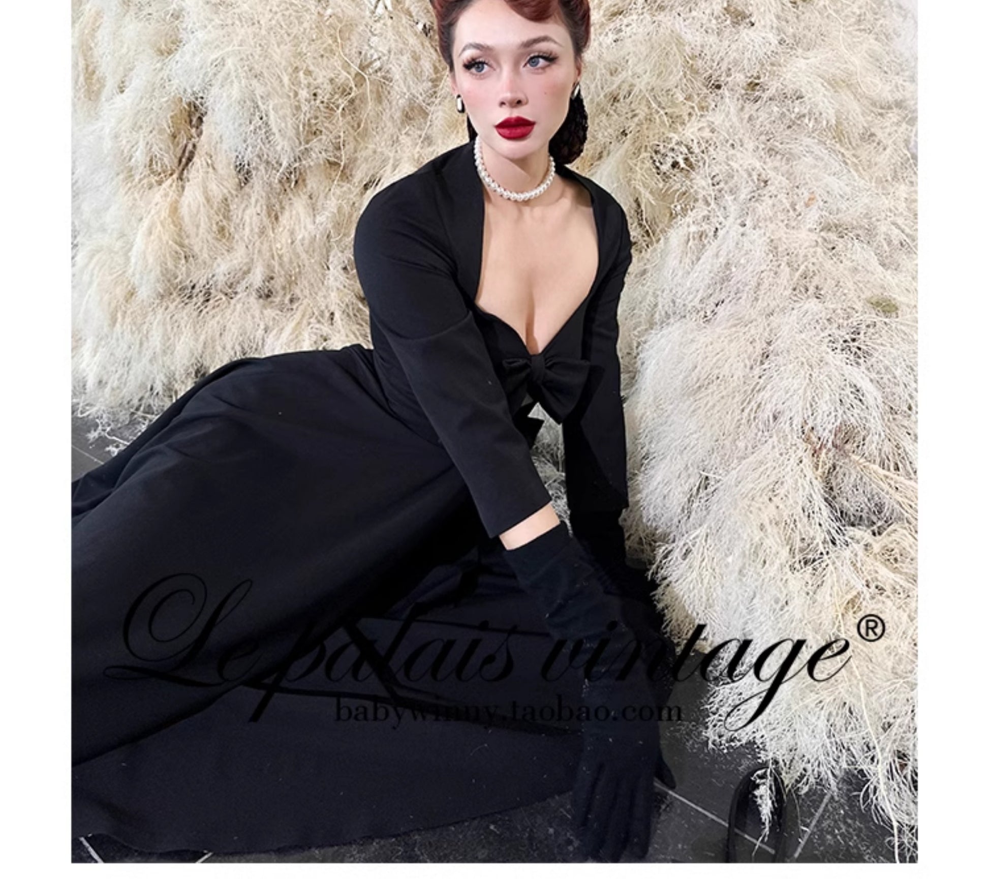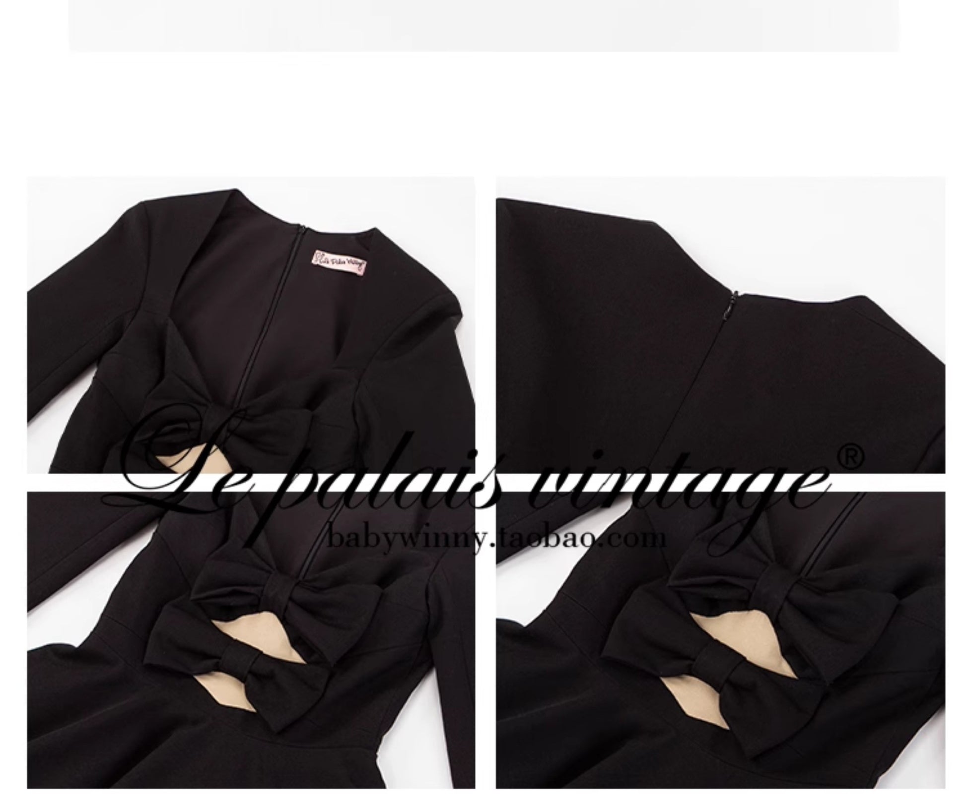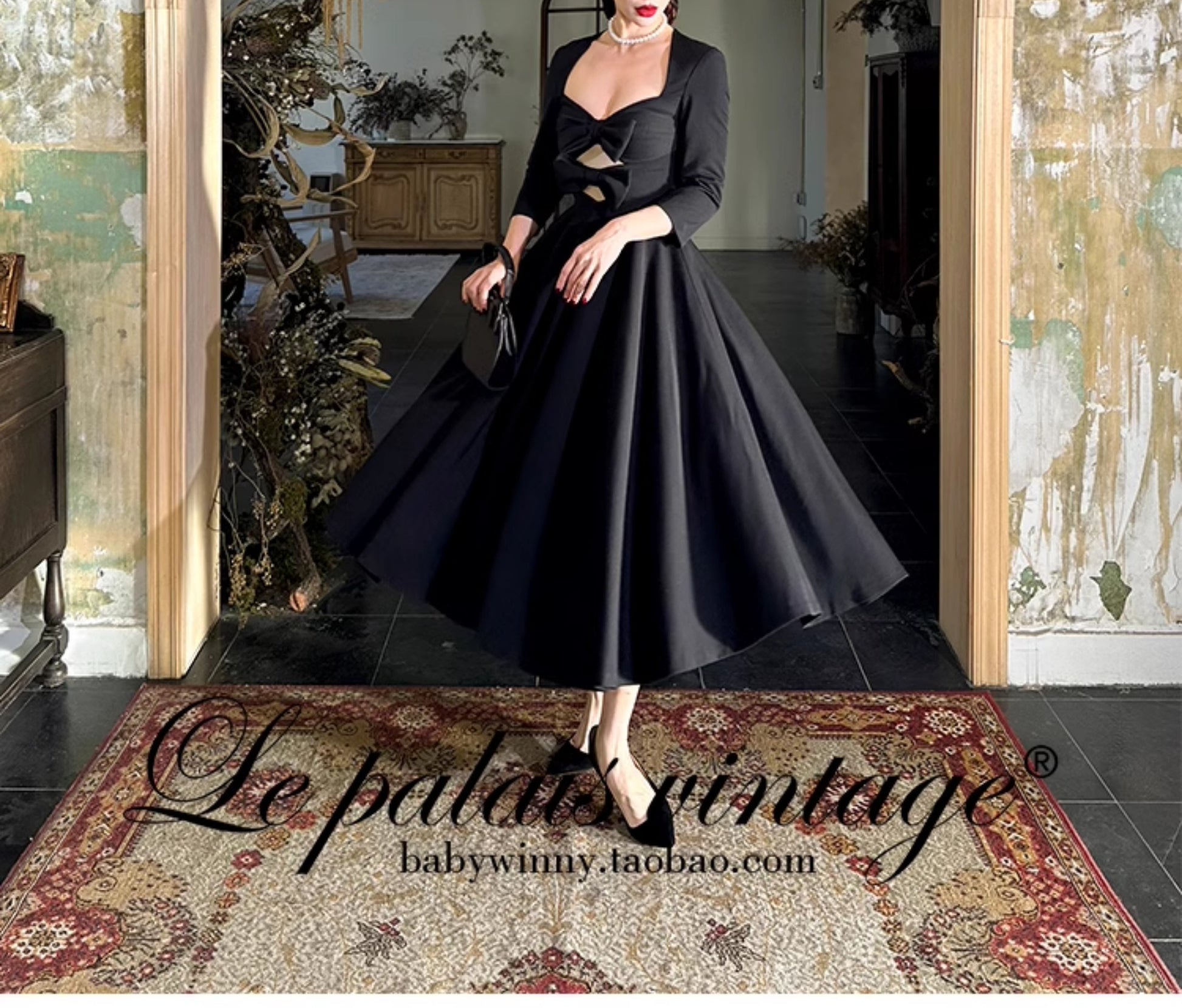 Le Palais Vintage Elegant Retro Long Sleeves Midi black Cocktail Dress-Aurora