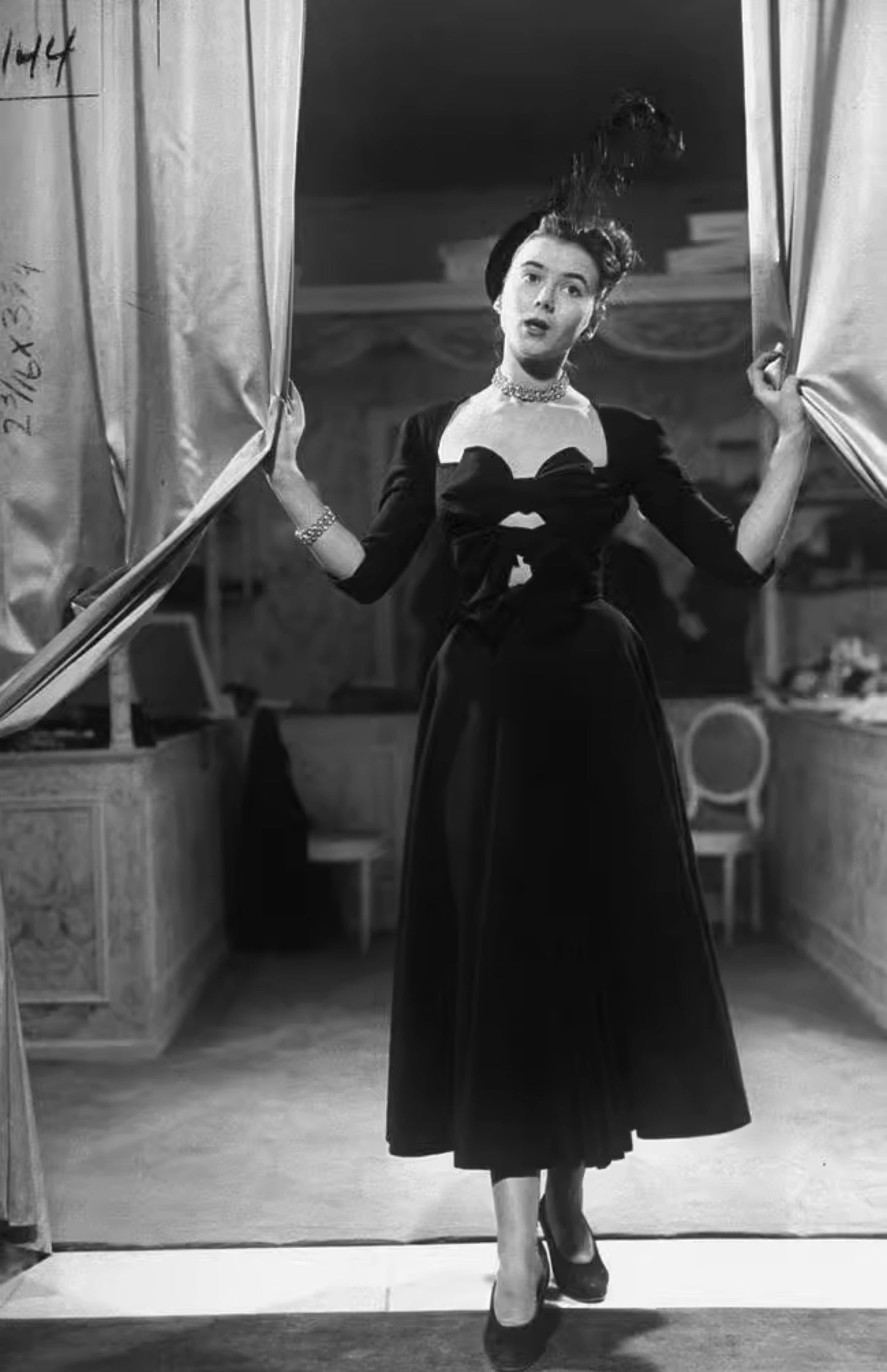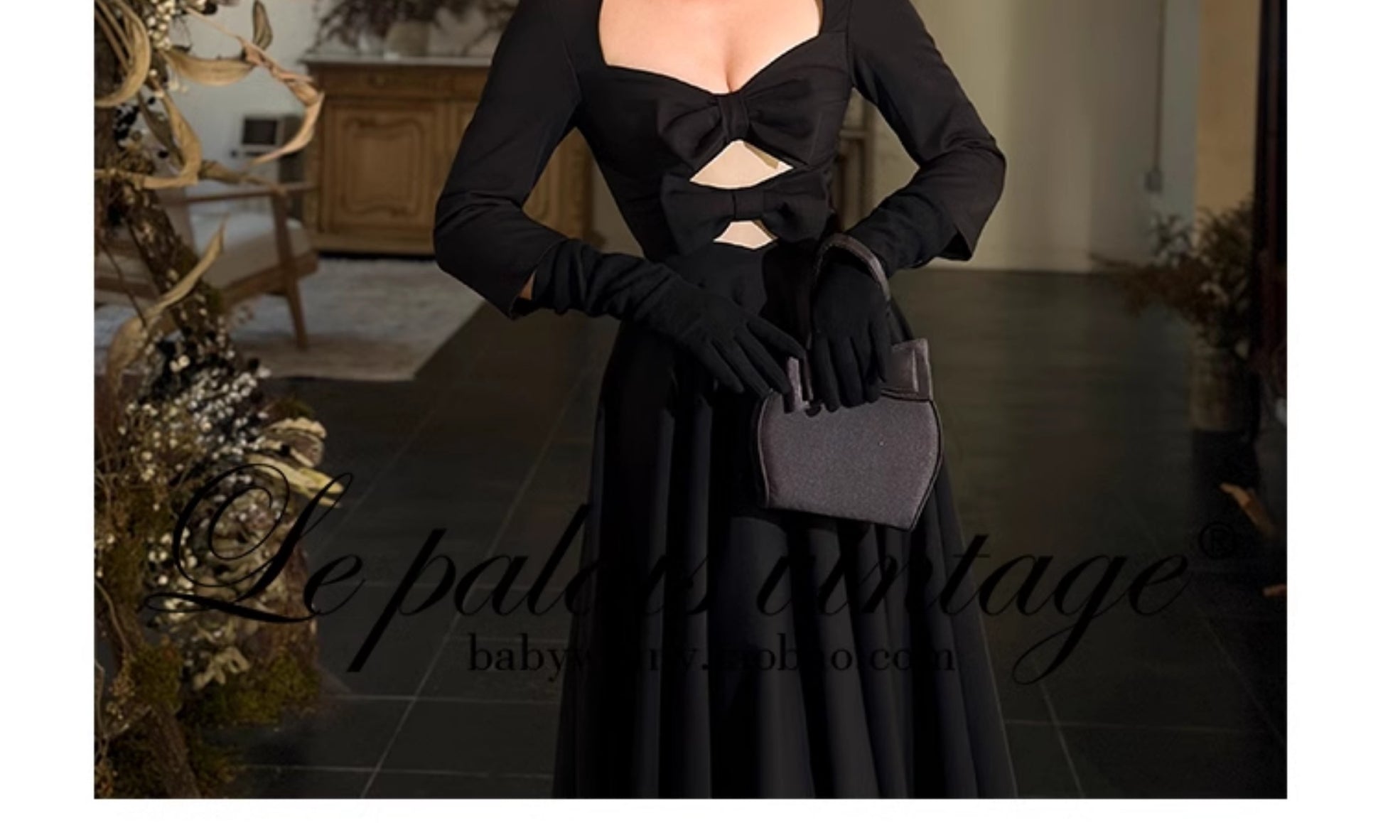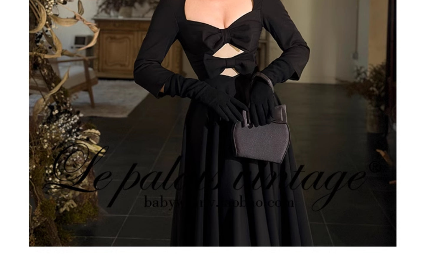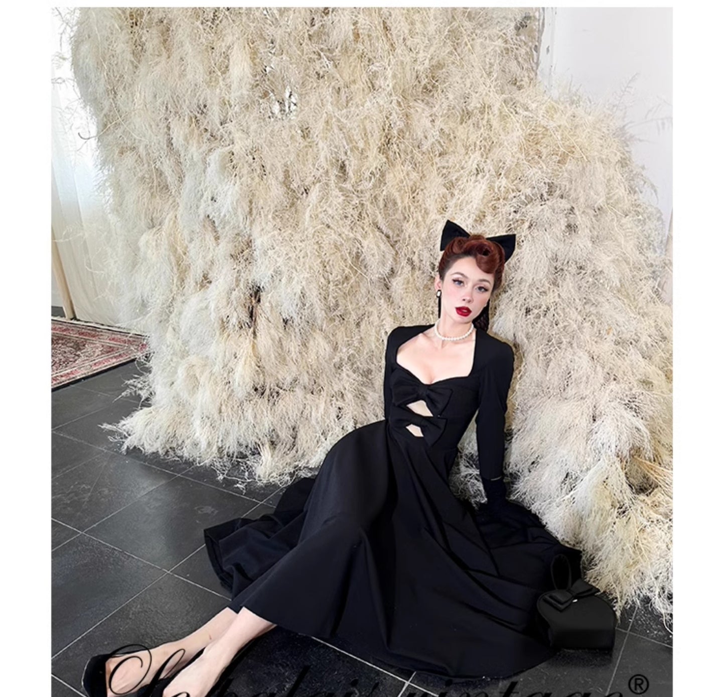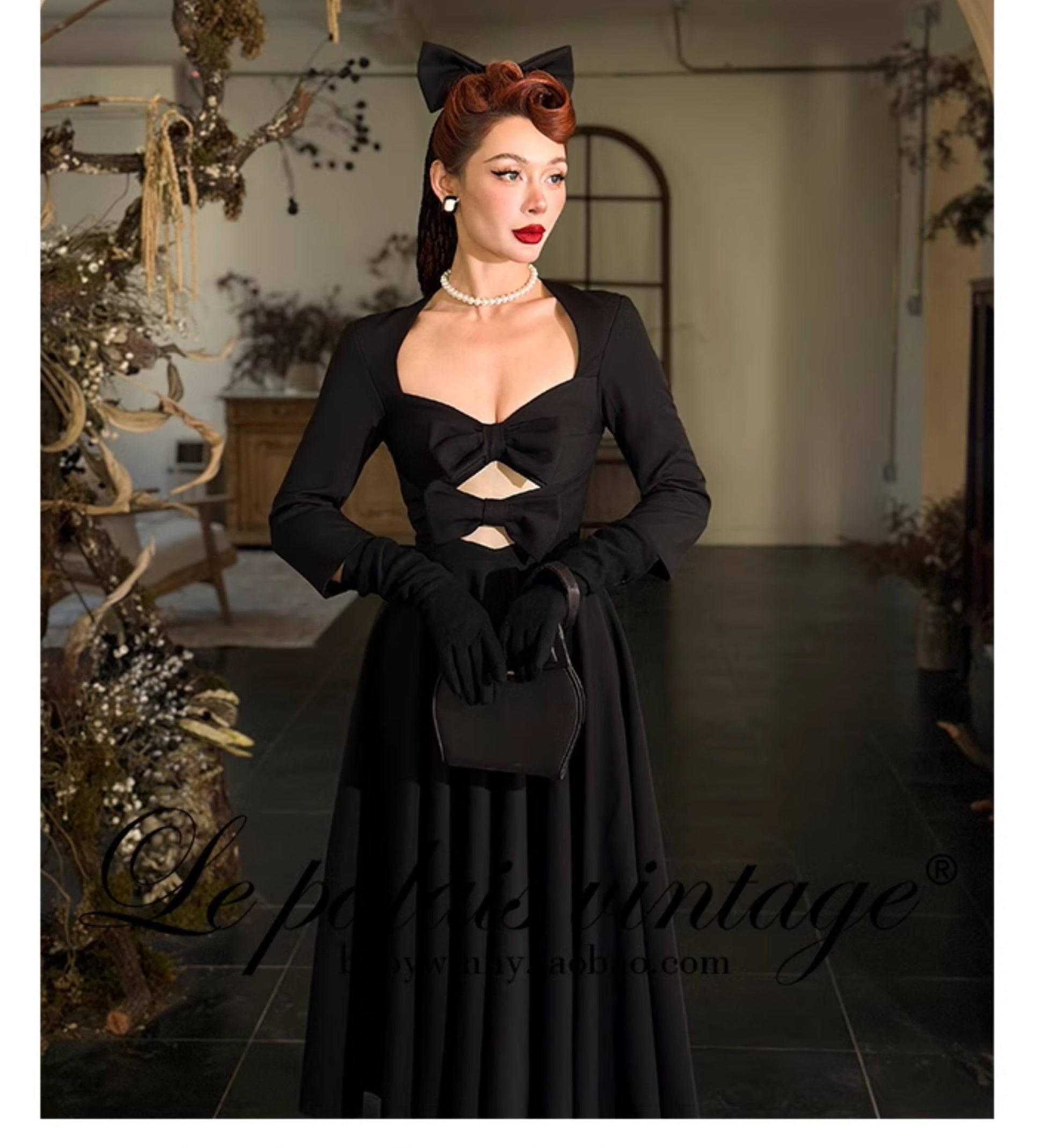 Le Palais Vintage Elegant Retro Long Sleeves Midi black Cocktail Dress-Aurora