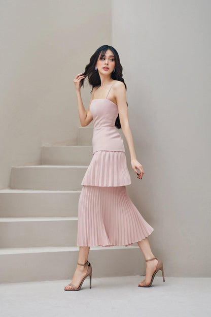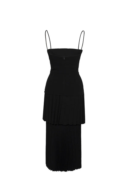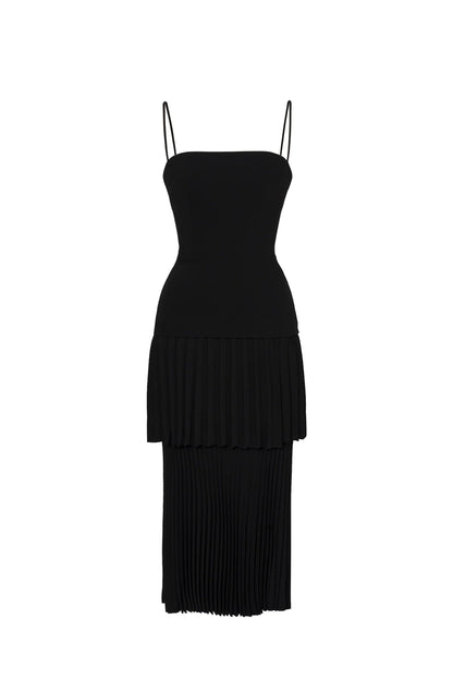 LUXURY ELEGANT SOPHISTICATED PLEATED SPAGHETTI LAYERED MIDI DRESS - JOAN