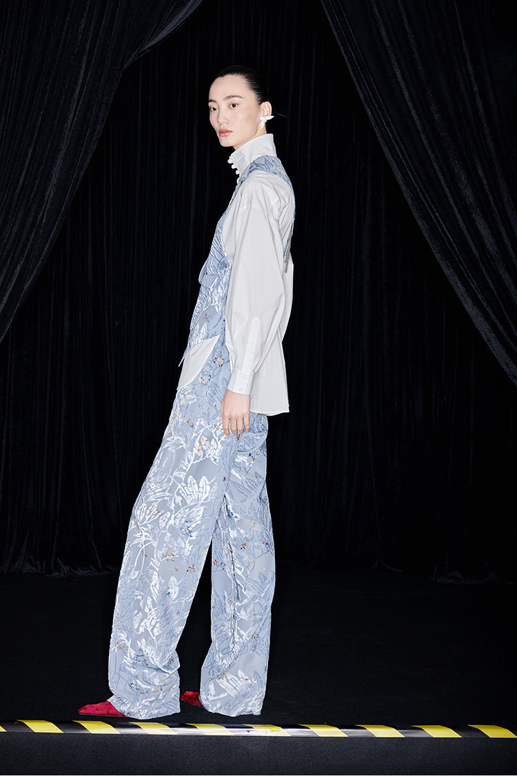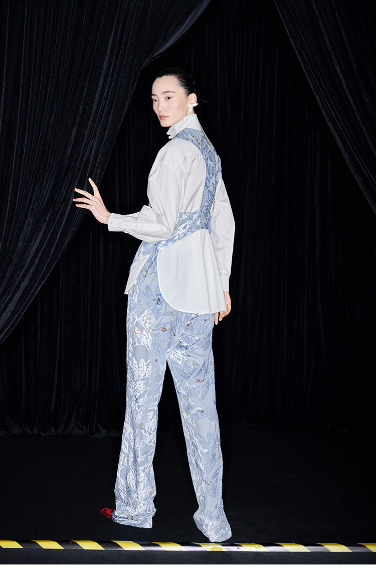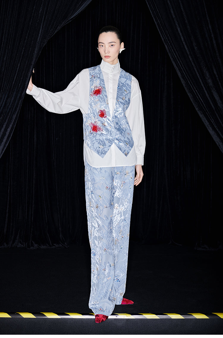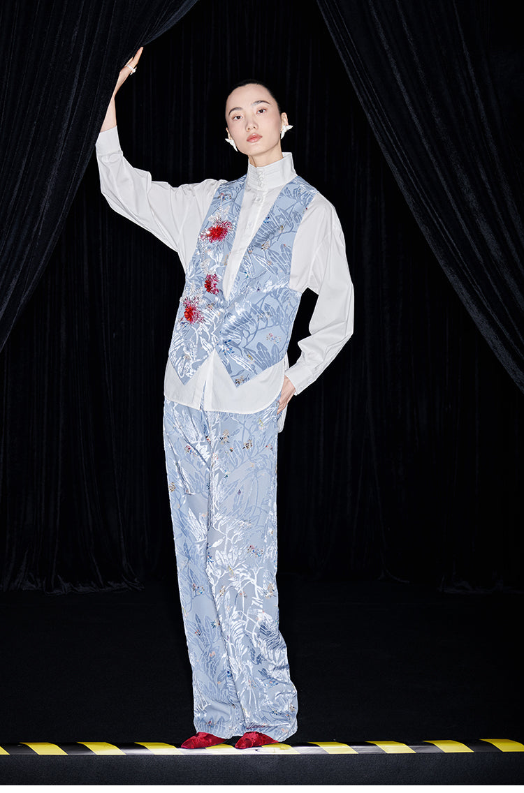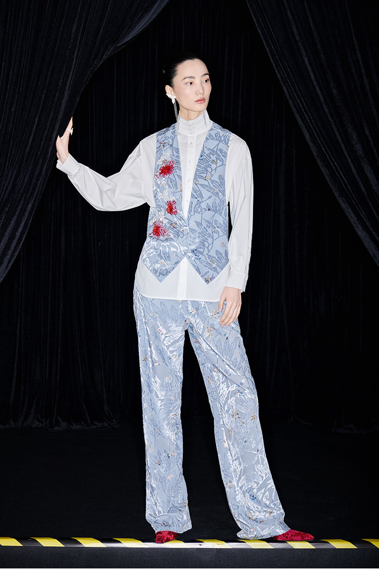 Stay stylish and elegant this summer with the M essential Mackay designer brand Haruyama embroidered eight treasures sedum vest. This chic blue vest comes with a matching pair of pants, and a long sleeve stand up collar white shirt for a fashionable look. Perfect for any event, stay cool and chic with this must-have piece.