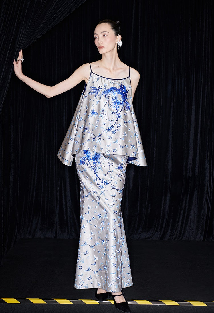 This M Essential Mackay designer dress features a jacquard fabric with a blue vine butterfly pattern, combining elegance with intricate detail. The sleeveless, spaghetti strap design highlights a deep V cut-out at the back, adding a sophisticated touch. Its long, floor-length silhouette is enhanced by a layered, flared skirt and a unique cape-like overlay starting at the bust, creating a tiered effect that gracefully complements the fitted skirt. Perfect for making a refined statement at any formal occasion.