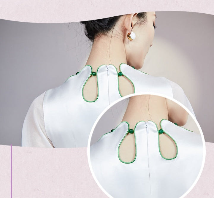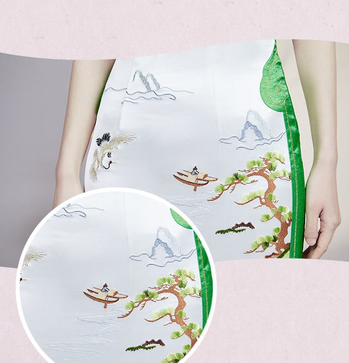 Elevate your look with Magic Q: embroidered with white heavy embroidery flowers and crafted with drop neck panels, gauze sleeves and a wishful cloud-toe cheongsam skirt, it is an elegant and daring statement piece. With a unique and sophisticated design perfect for Autumn, Magic Q is the perfect combination of chic, classic, and gorgeous.