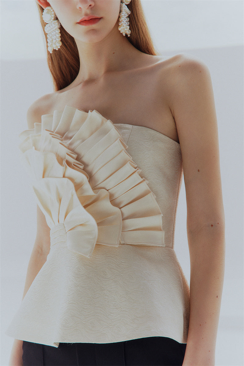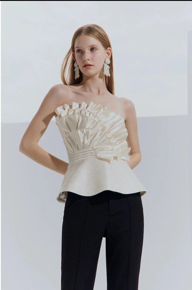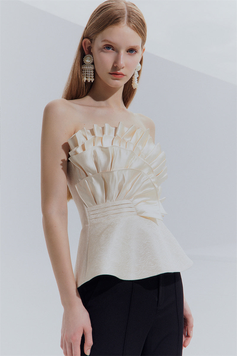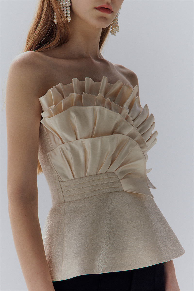 Entertain with an elevated air of sophistication in this Purity high-end light luxury champagne design sense satin bandeau top. In a soft and exclusive champagne gold hue, this exquisite statement piece boasts an effortlessly chic shape and beautiful feminine flair, making it a timeless choice for any special event or season. Unique and unforgettable, this stunning top is sure to become a timeless favorite in any modern woman's wardrobe.
