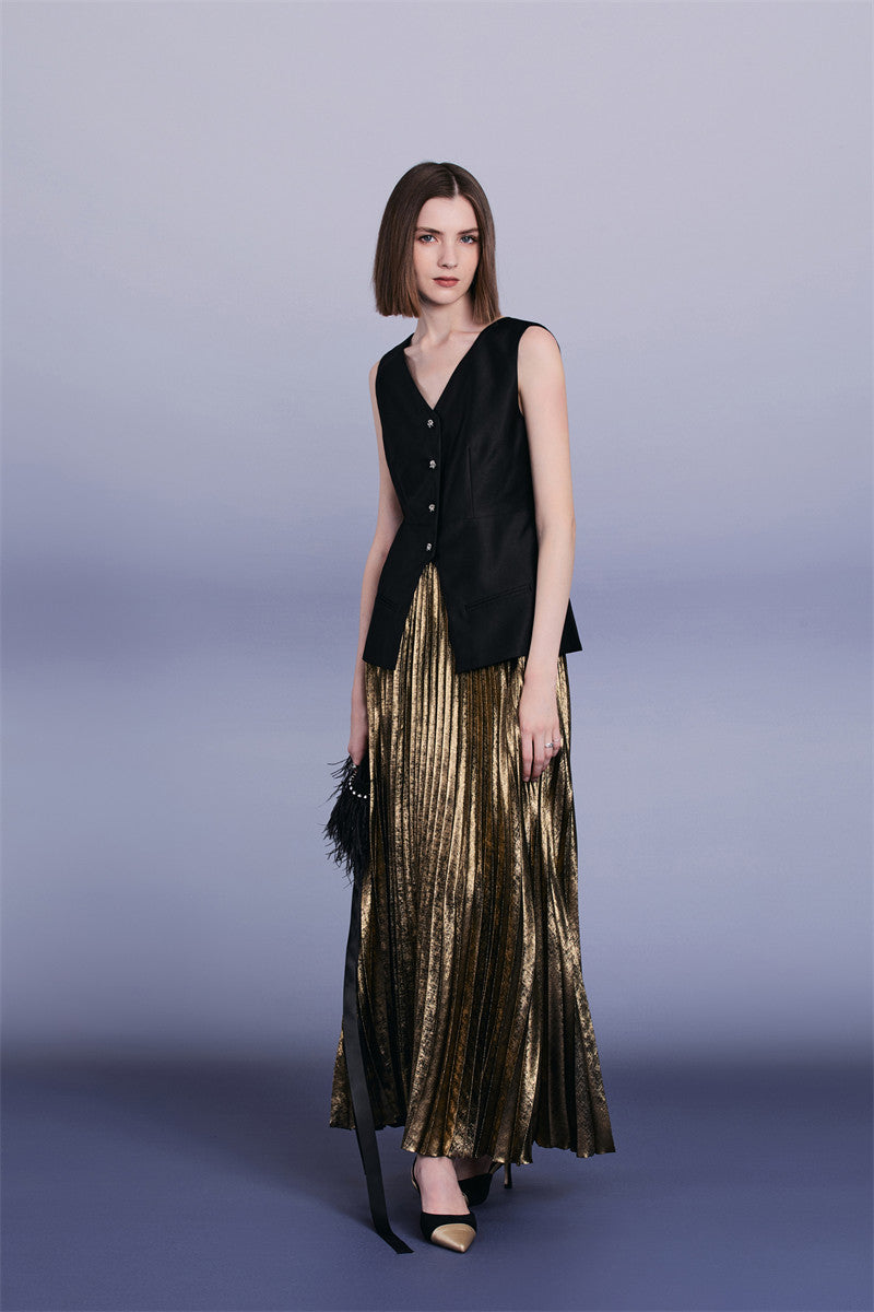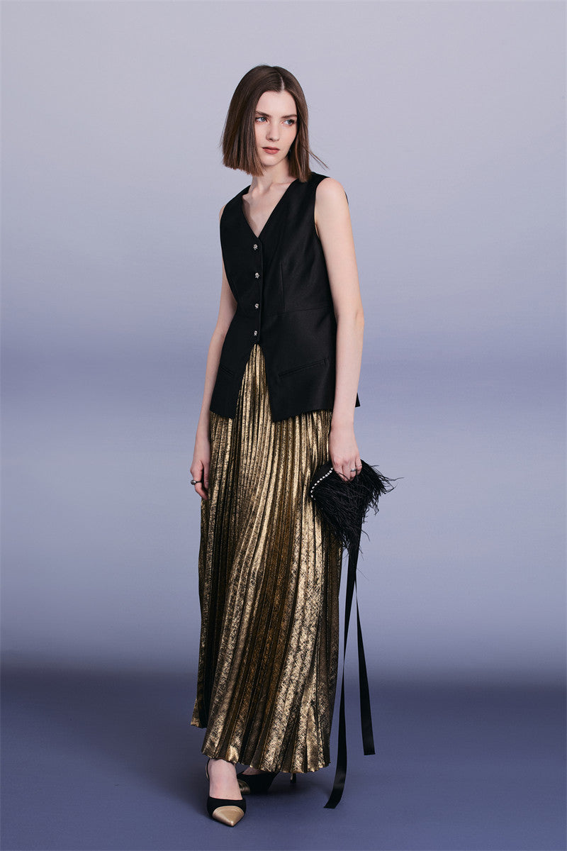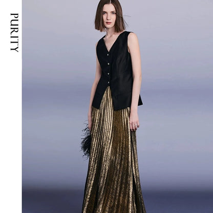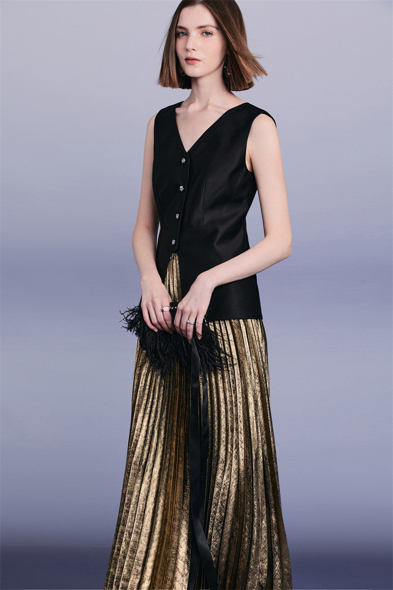 PURITY Luxury British style classic black vest lacquered dark gold pressed pleated skirt set- Lizzy