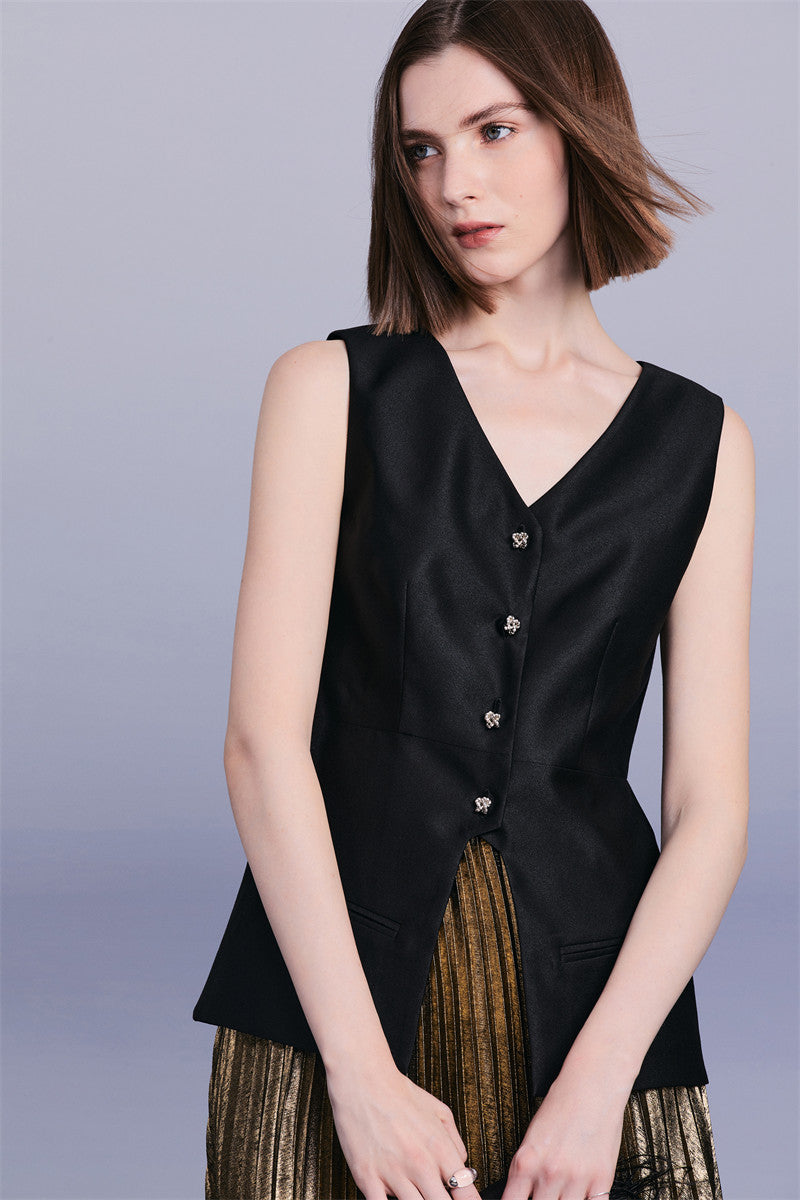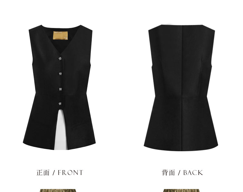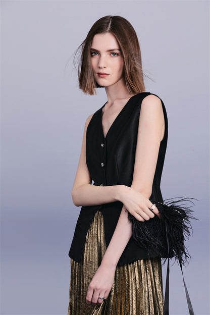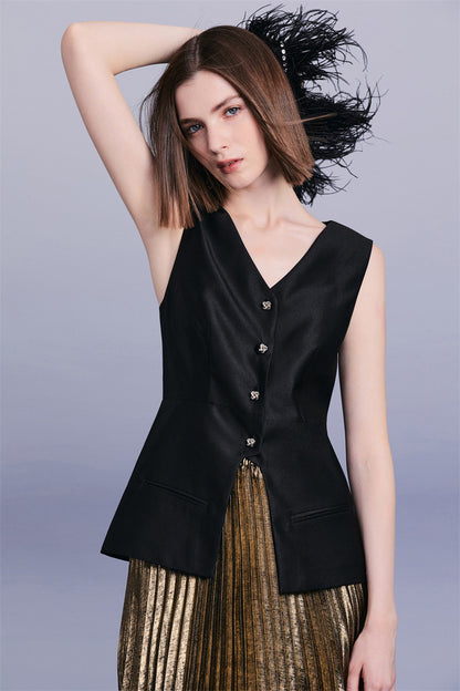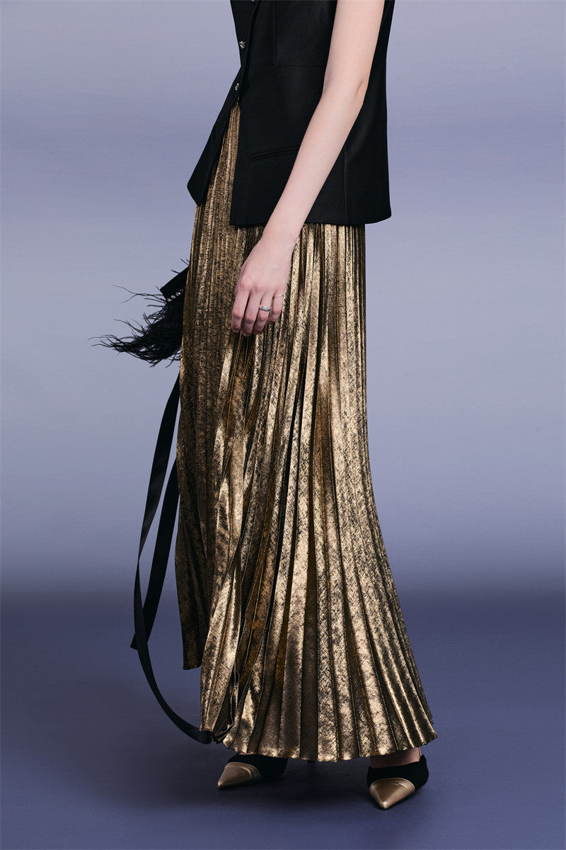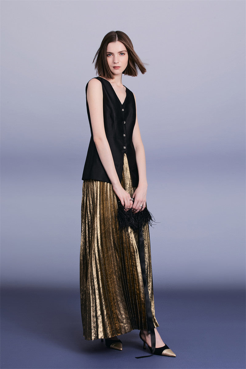 PURITY Luxury British style classic black vest lacquered dark gold pressed pleated skirt set- Lizzy
