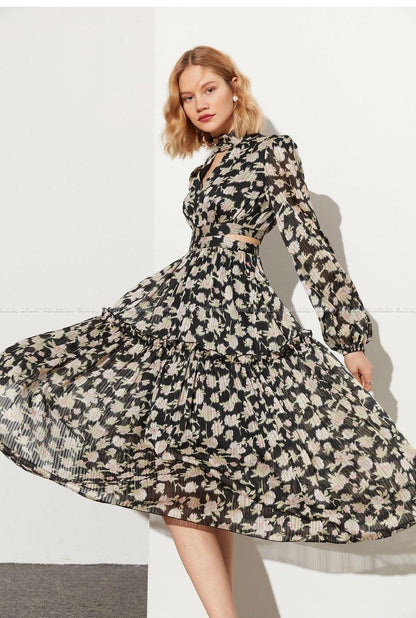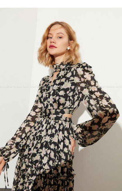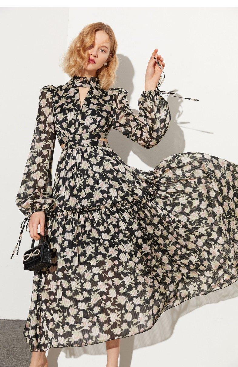 Retro pastoral print cutout design chiffon long-sleeved print dress- Rita