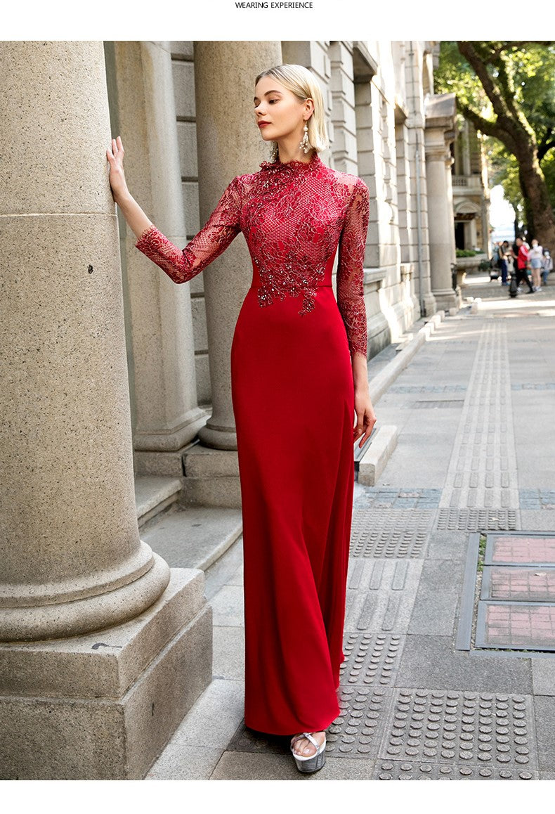 SIDUO Elegant Plain Long Sleeve Round Neck Ankle Length Burgundy Wedding dress-Antoinette ( V )