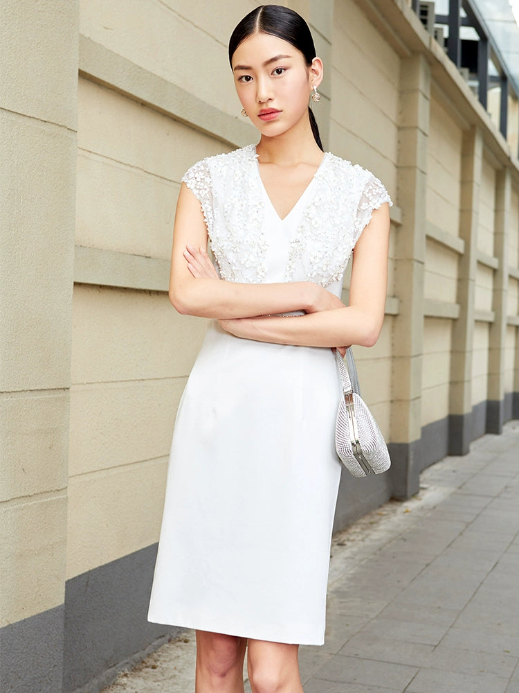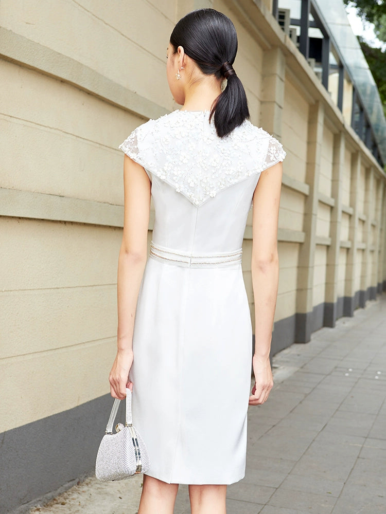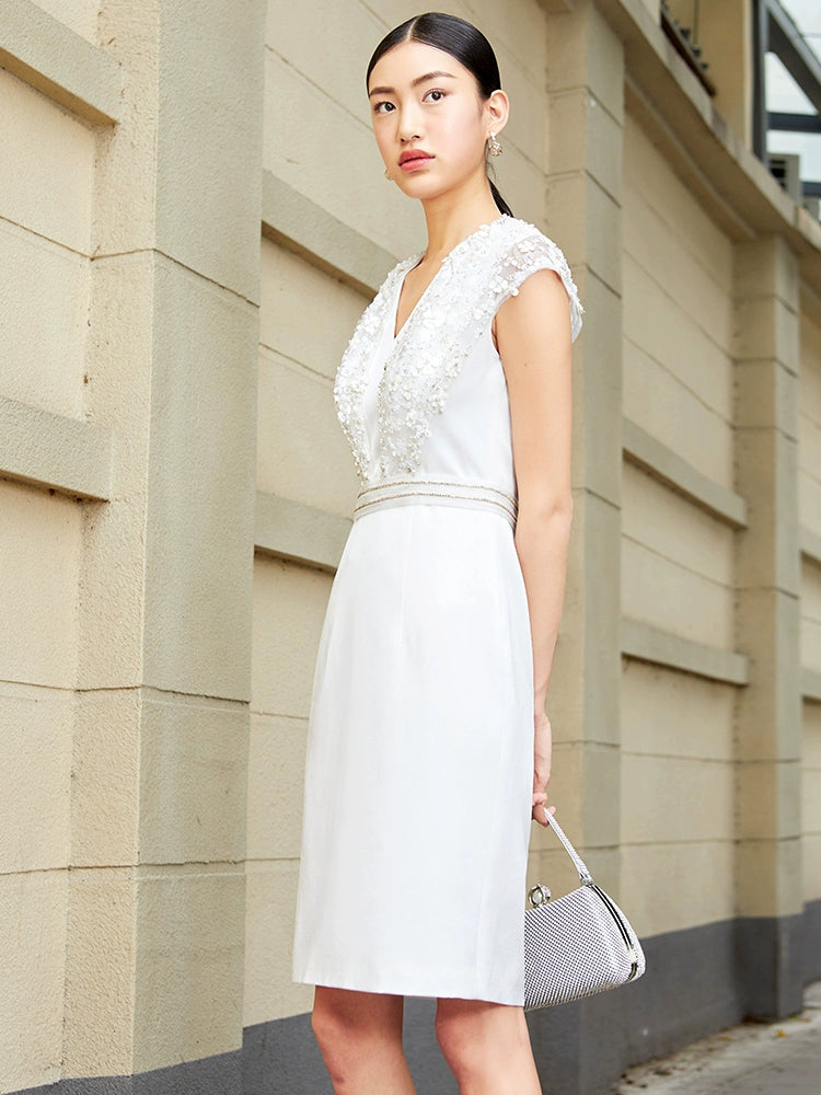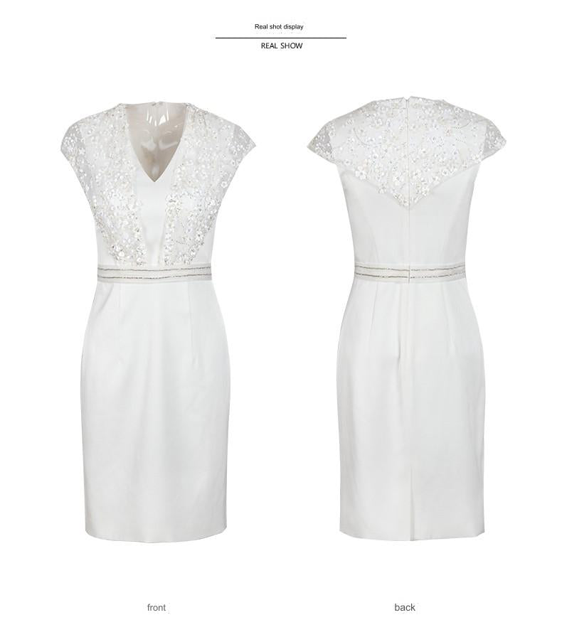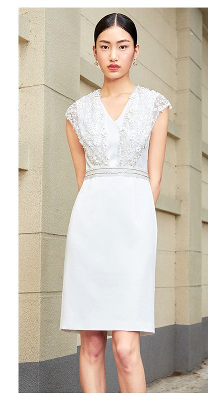 SIDUO Elegant Summer midi sleeveless V-neck slim fit mid skirt white simple dinner dress-Rosa ( V )