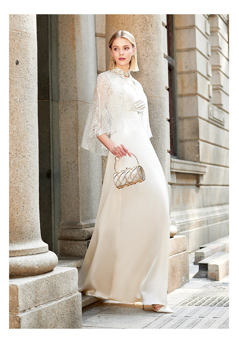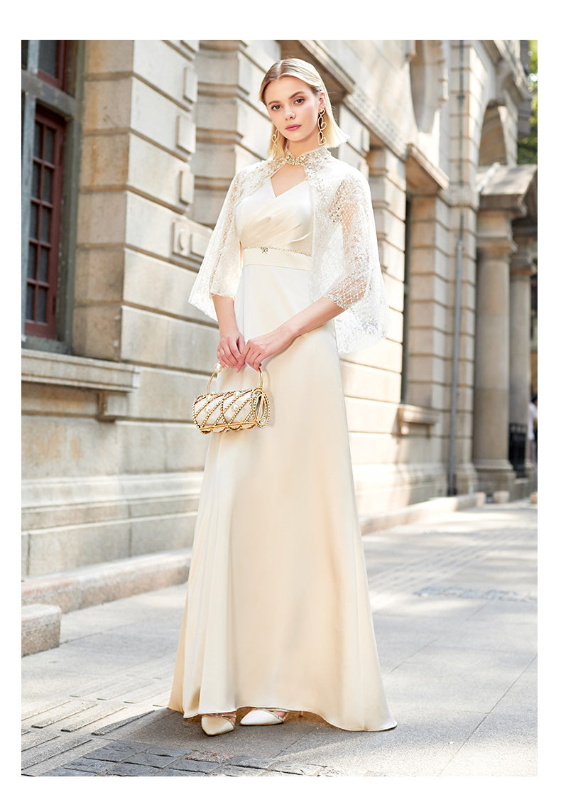 SIDUO high-end lace shawl cape sleeve V neck cream evening dress-Kendra ( V )