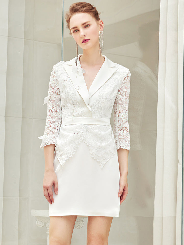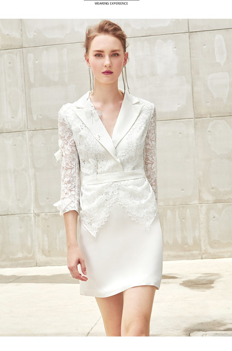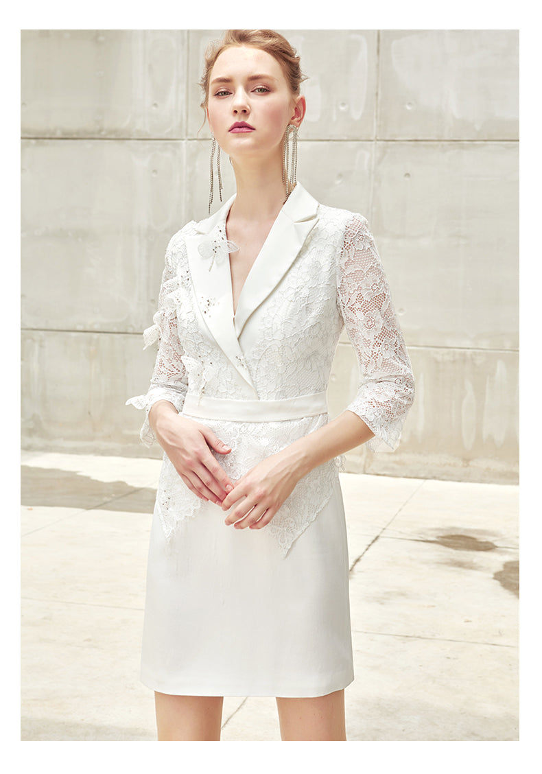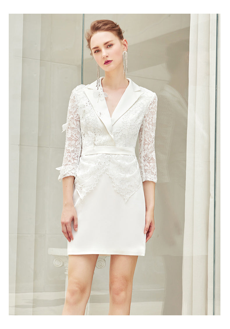 SIDUO Luxury midi nine quarter sleeves mid waist deep V-neck embroidered white party dress-Charlotte ( V )