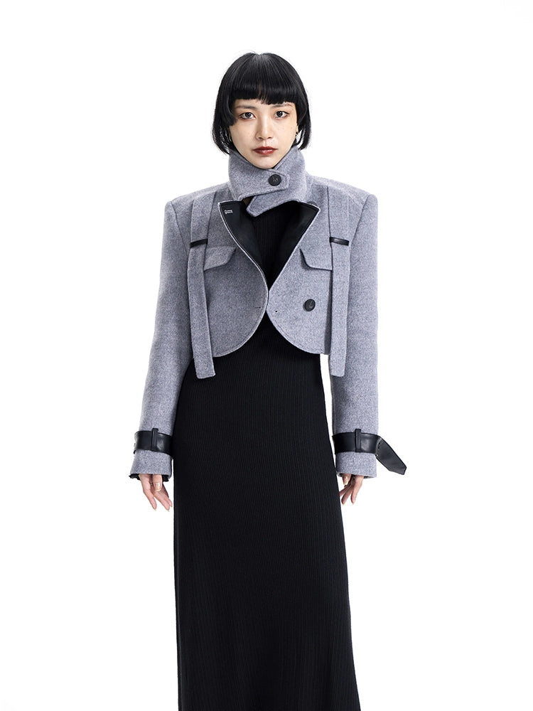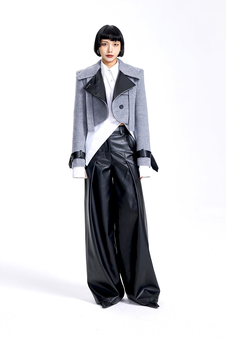 TINY IN leather stitched cropped women's wool jacket -DEKU