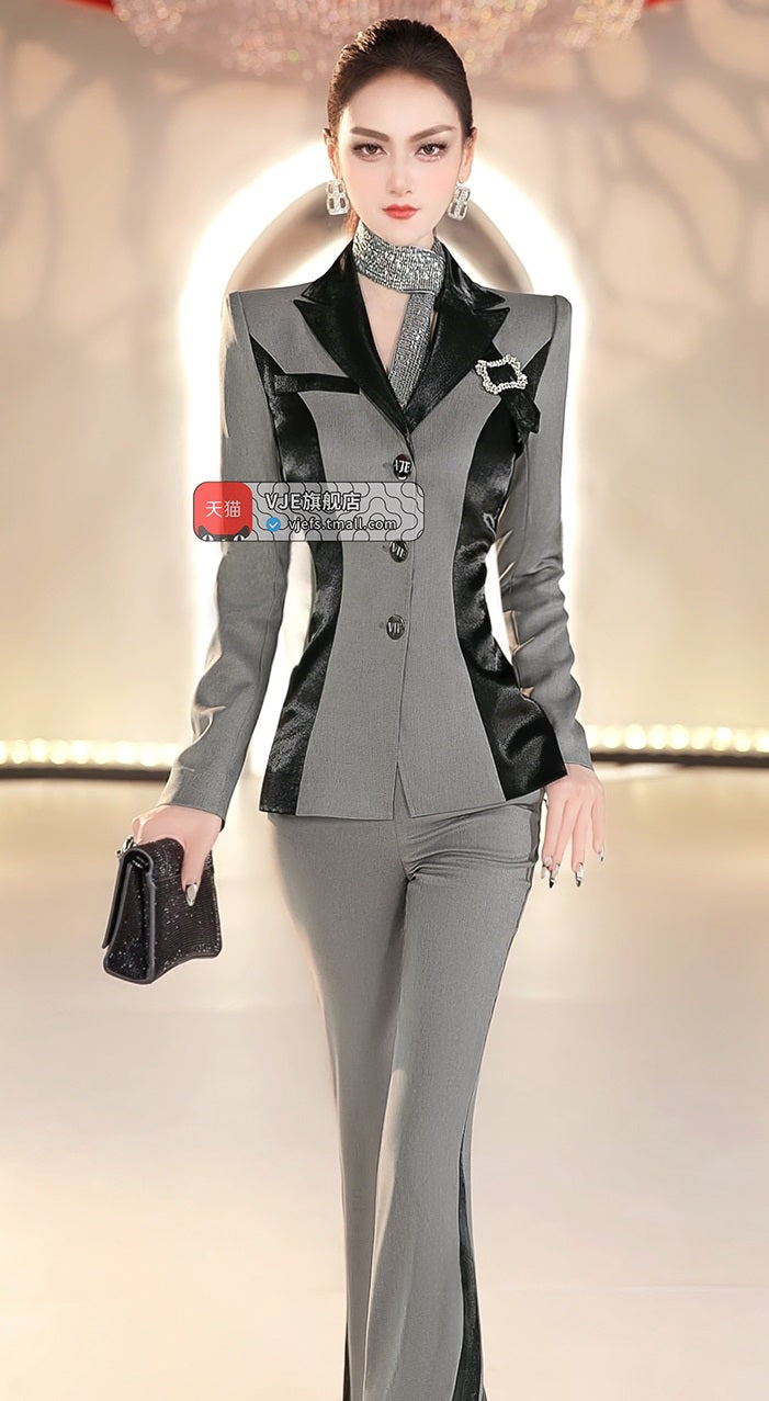 VJE Color-Blocking Suit Micro Flared Pants Two-Piece Set - YUN.