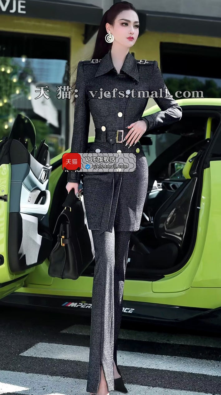 VJE slim trench coat jacket micro flared pants two-piece outfit set-YAN.