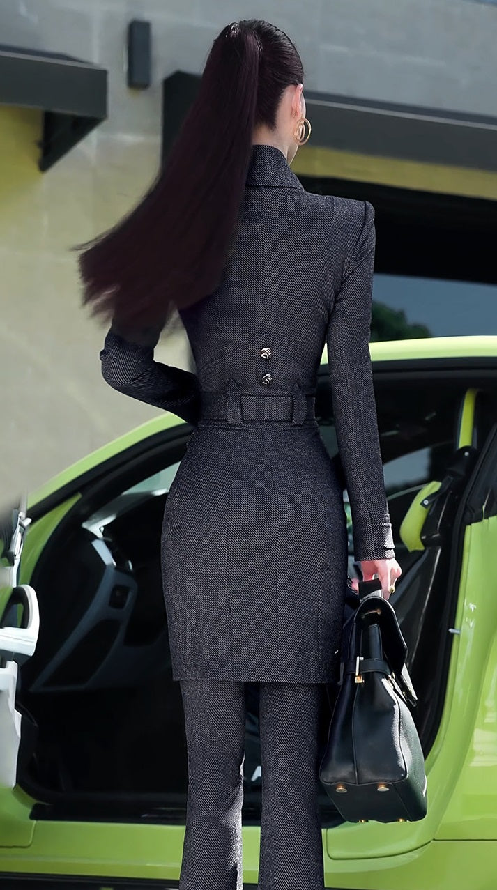 Elevate your wardrobe with this refined two-piece ensemble featuring a tailored slim trench coat paired with elegantly micro-flared pants. The structured jacket exudes timeless sophistication with its clean lines and classic silhouette, while the subtly flared pants add contemporary flair and movement. Perfect for creating polished, put-together looks that transition seamlessly from professional settings to upscale casual occasions. This versatile set embodies modern elegance with a touch of understated luxury, making it an essential addition for those who appreciate quality craftsmanship and refined style.