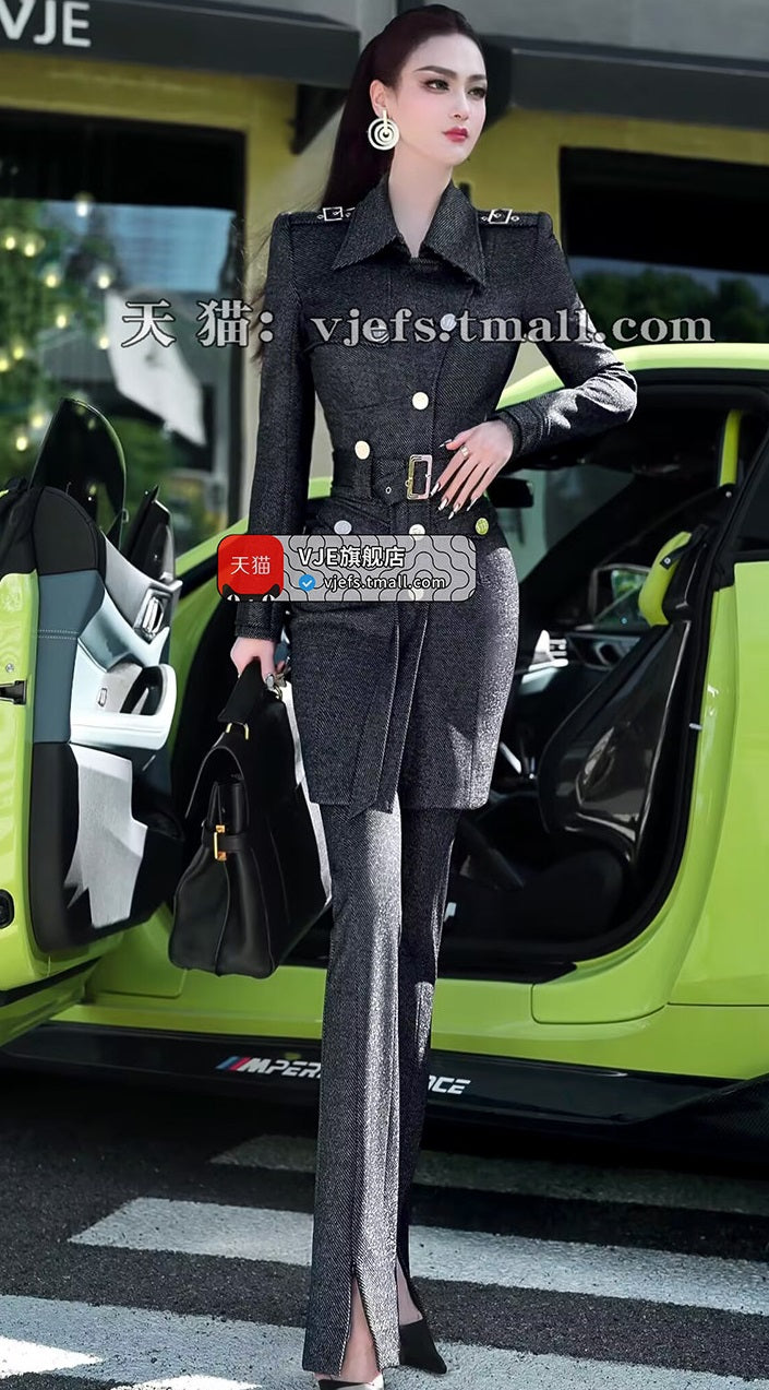 VJE slim trench coat jacket micro flared pants two-piece set - YAN.