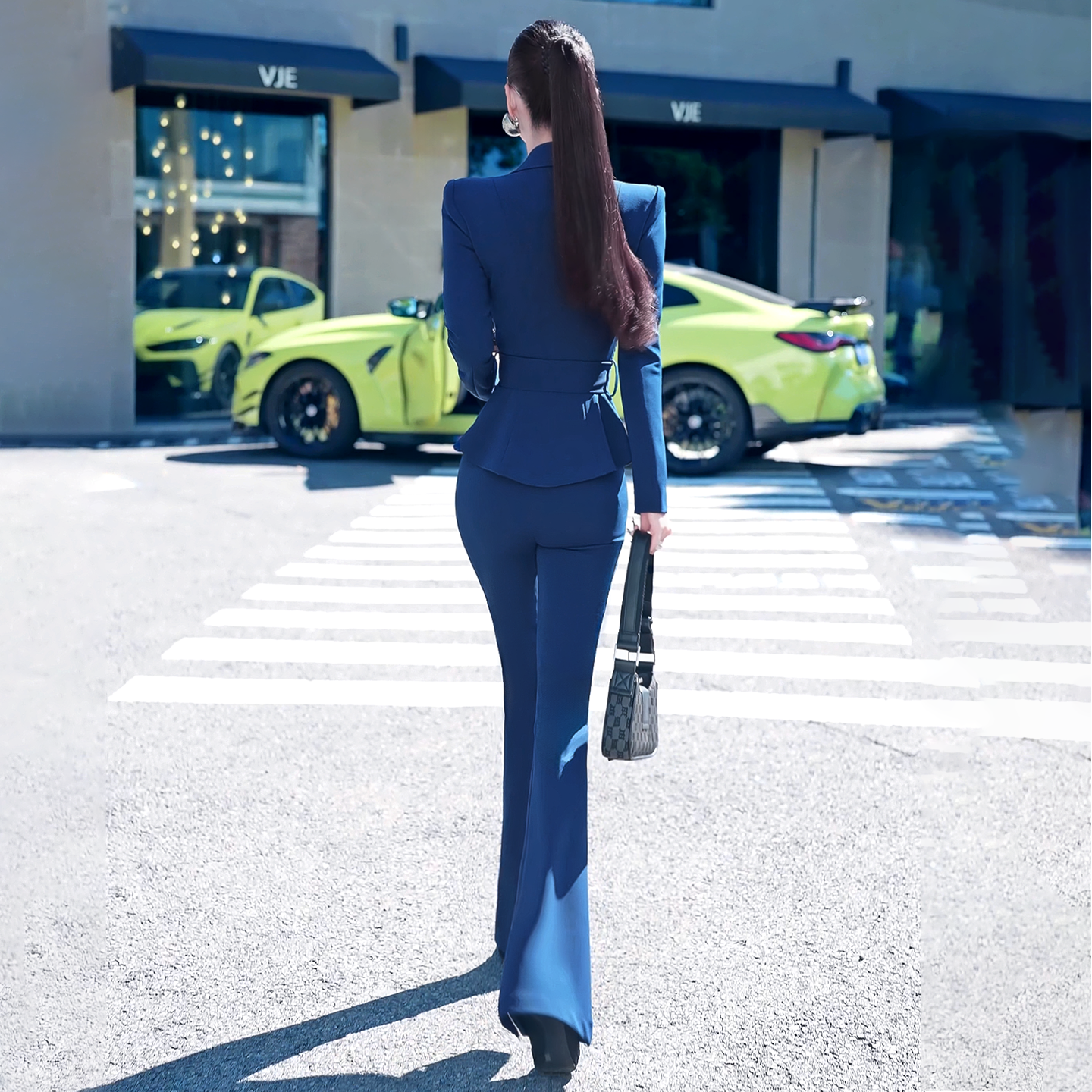 Elevate your professional wardrobe with this refined two-piece suit set. Featuring a tailored OL jacket paired with micro flared pants, this ensemble strikes the perfect balance between classic elegance and contemporary style. The structured jacket provides a polished silhouette, while the subtly flared pants add a modern twist to traditional suiting. Ideal for the office, business meetings, or upscale occasions, this versatile set delivers timeless sophistication with an understated edge. Perfect for the woman who commands attention through refined taste and impeccable style.