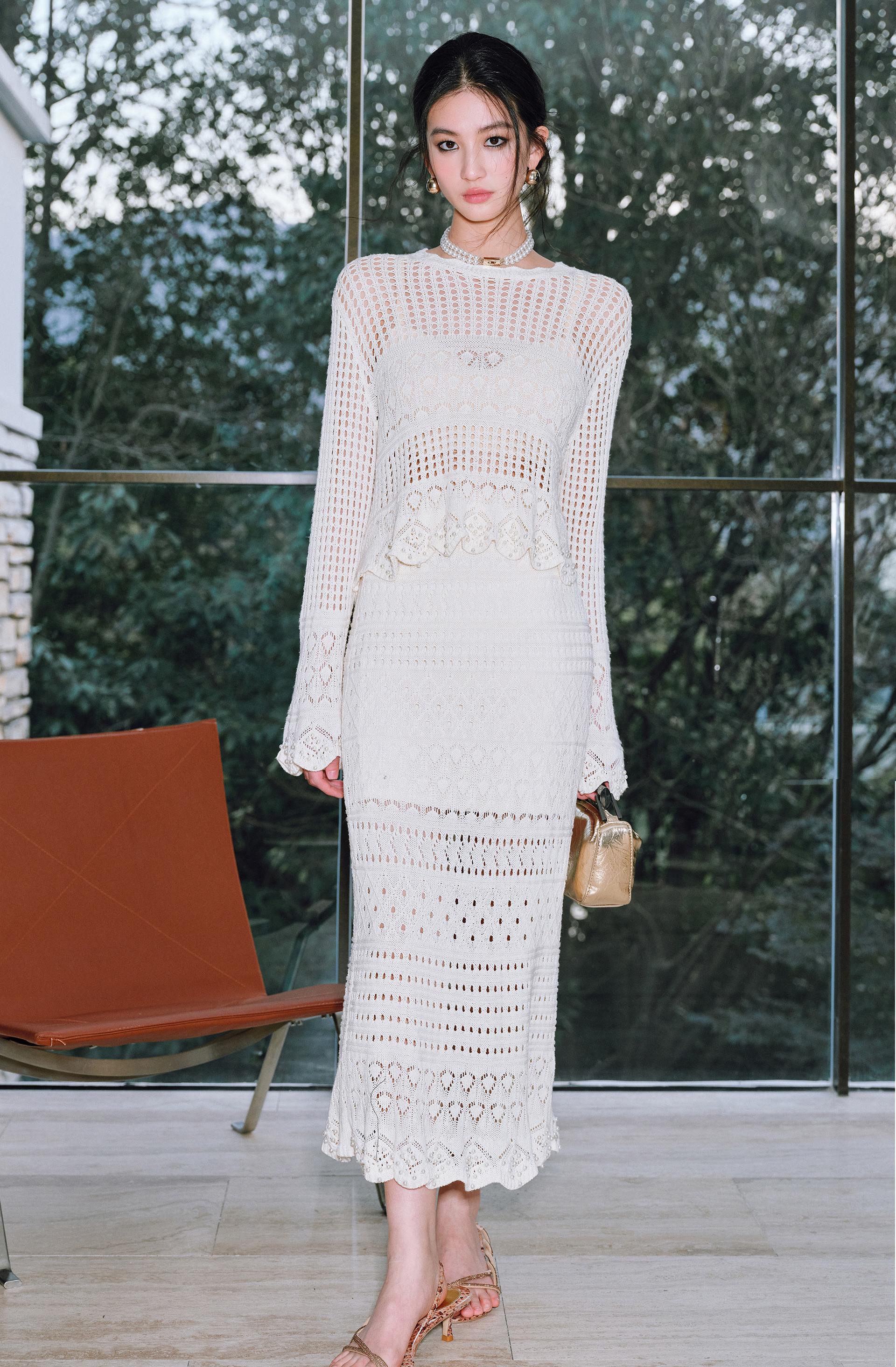 Elevate your wardrobe with the WANGXO set, featuring an imported washi paper yarn crafted into a delicate hollow weave. This expertly handmade ensemble combines a beaded flared sleeve top with a fishtail skirt, offering a refined silhouette that balances texture and elegance. Perfect for sophisticated occasions, the lightweight fabric ensures comfort while the intricate detailing highlights artisanal craftsmanship.