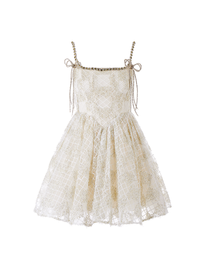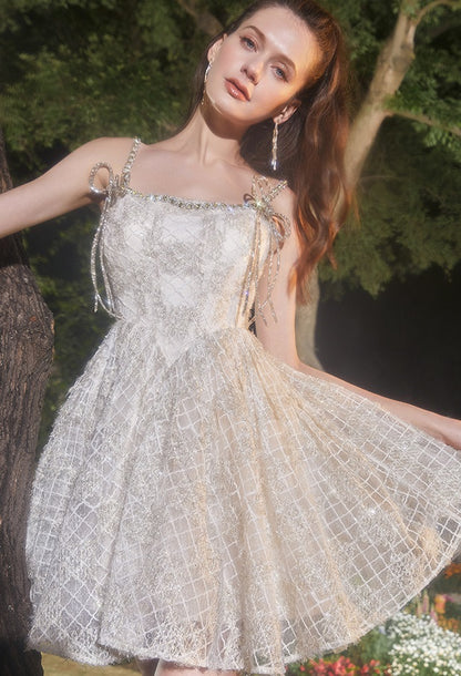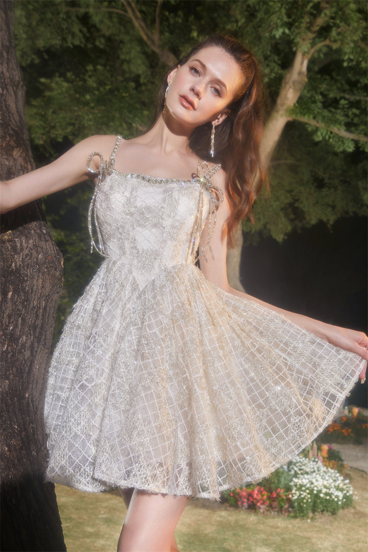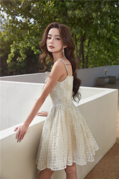 Wardrobes by Chen Elegant Off White beige Square Collar Sleeveless lace cocktail Dress-Hilda