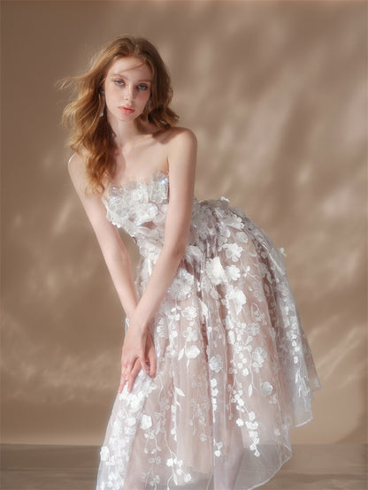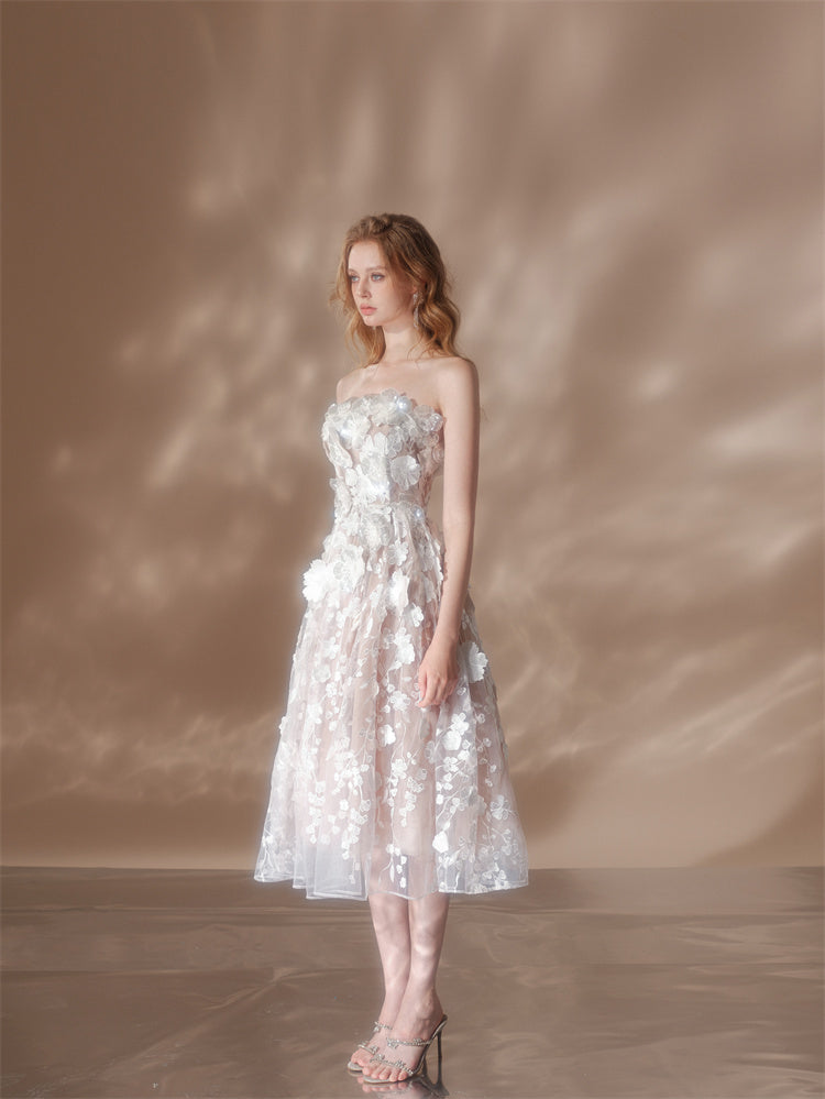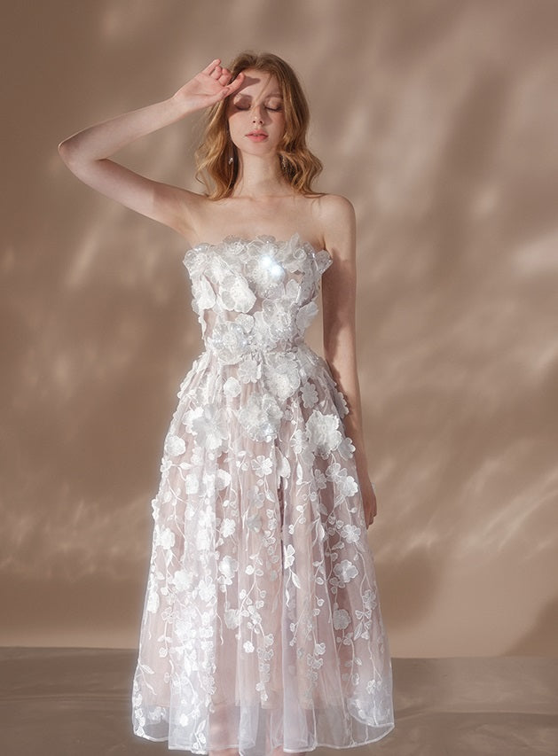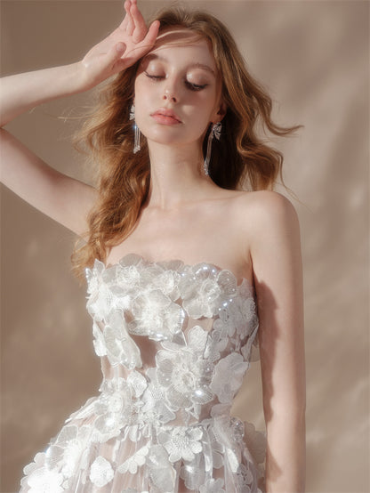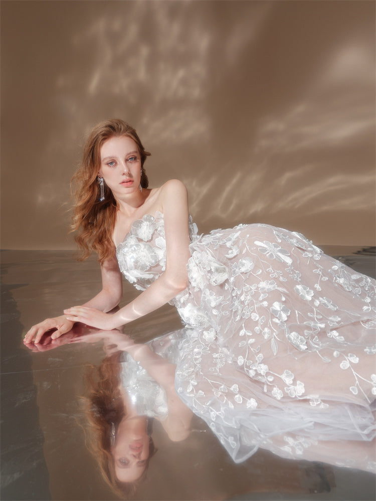 Introducing Wardrobes by Chen Elegant White Flower Lace Bandeau Wedding Dress. This stunning dress is designed with elegance in mind, featuring a beautiful white flower lace bandeau that will make any bride feel like a true luxury brand. Perfect for a sophisticated and exclusive wedding, this dress is sure to make a lasting impression.