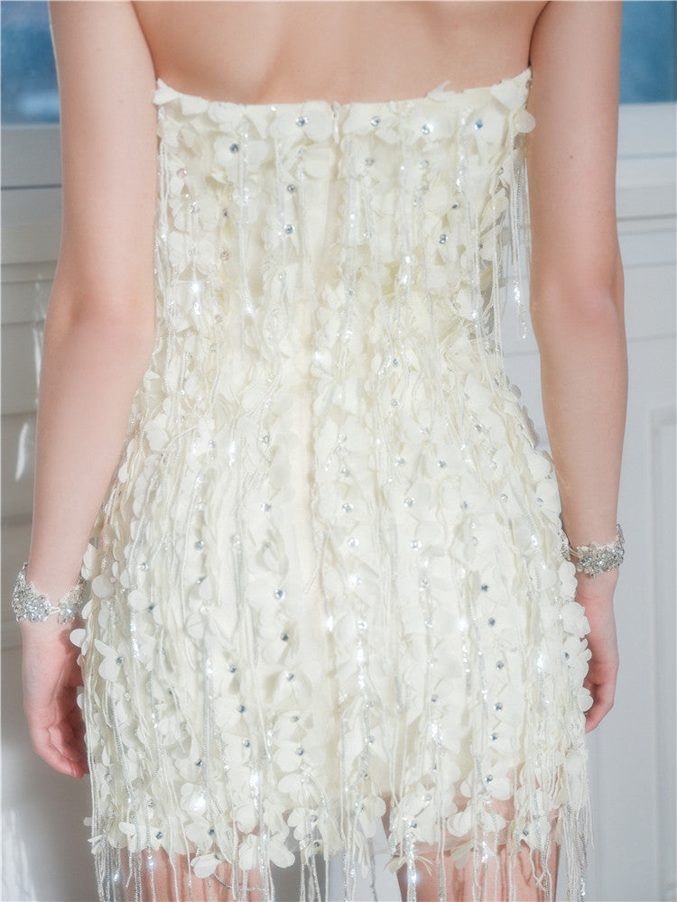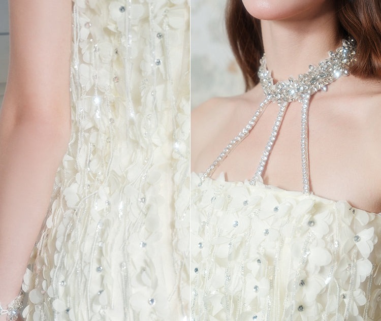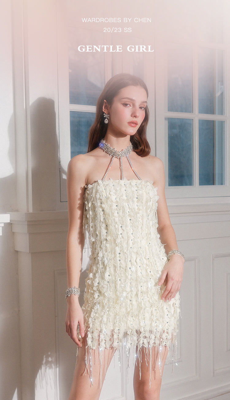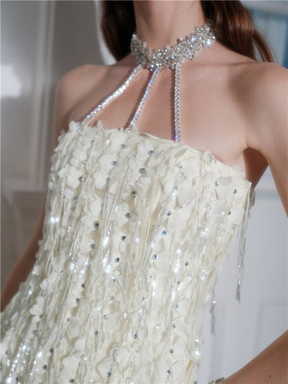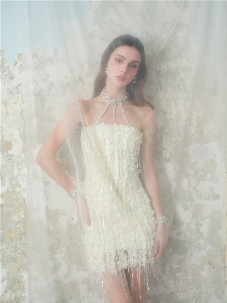 Wardrobes by Chen Elegant Yellow Chain Tassel Flower Halter Dress-Temi