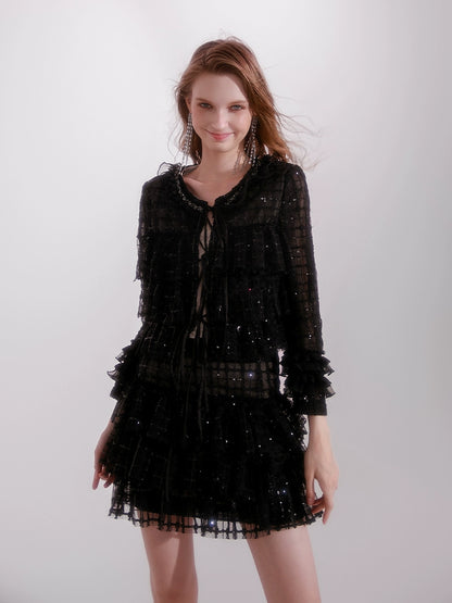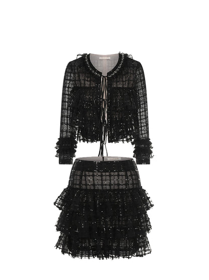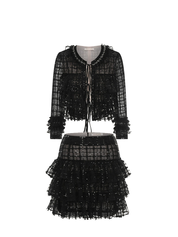 Wardrobes by Chen High End Black Sequin Checkered Coat/ Pleat Lace Skirt- Terai