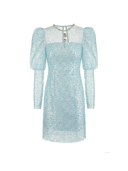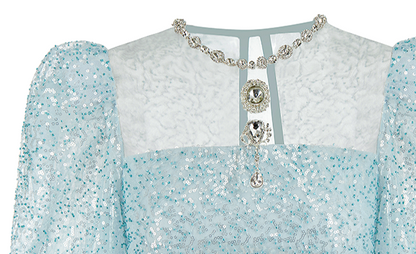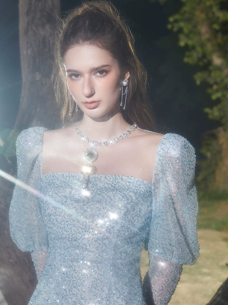 Wardrobes by Chen High End Blue Square Collar Long Sleeve Diamond Dress-Hale