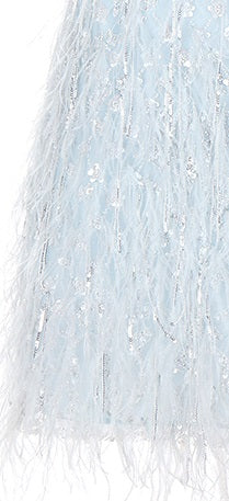 Enhance your elegance with our Chen Luxury Wardrobe. This blue sleeveless dress features a feather, sequin, and tassel design that exudes class and sophistication. Perfect for making a statement at any event.