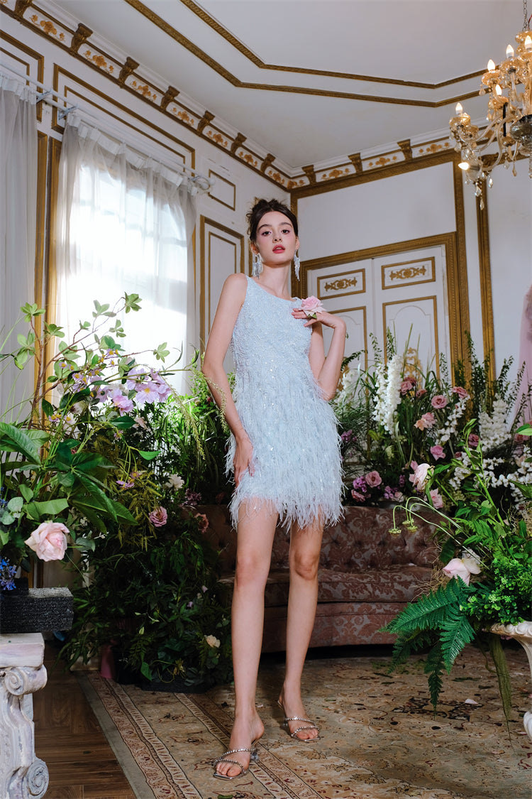 Wardrobes by Chen Luxury Blue Sleeveless Feather Sequin Tassel Short Dress-Tega