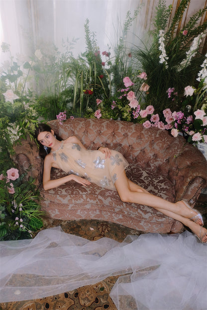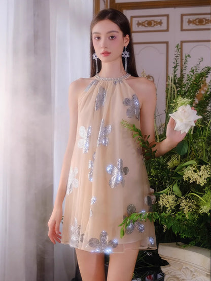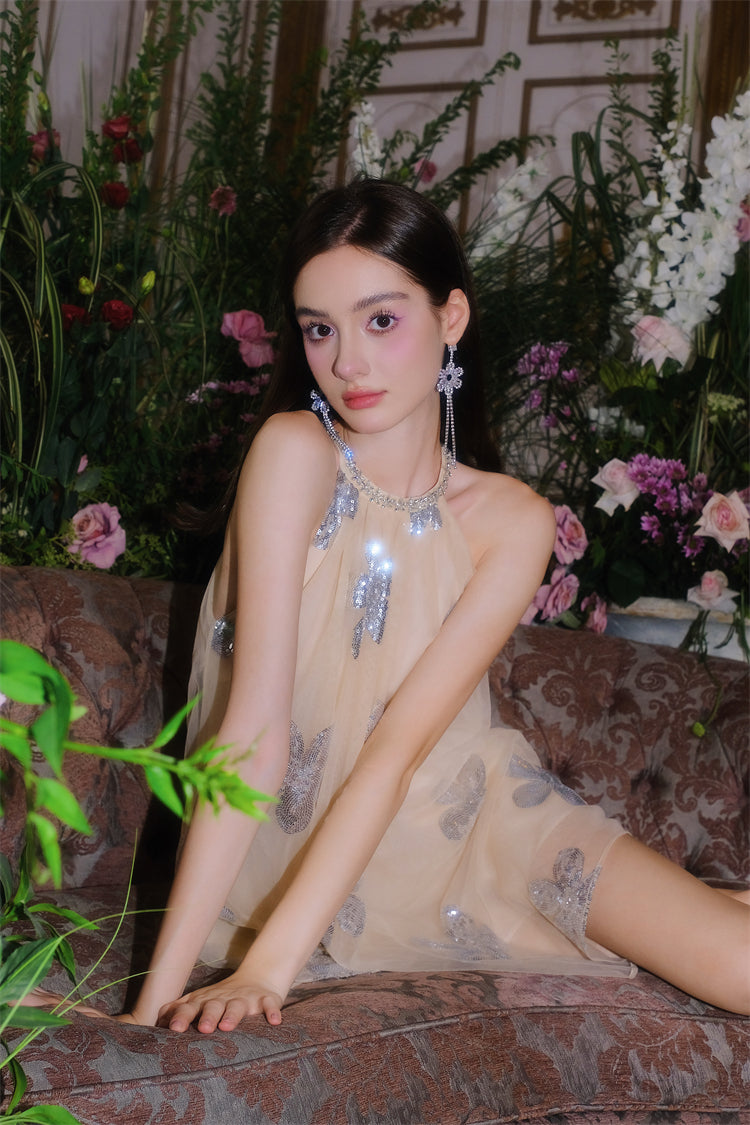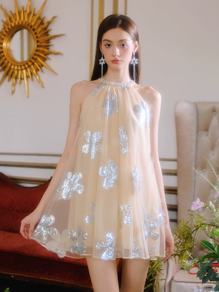 Indulge in luxurious elegance with our Wardrobes by Chen short party dress, adorned with stunning nude flower sequin embroidery. Every detail exudes chic, lovely sophistication, making it the perfect addition to your wardrobe. Elevate your style and make a statement with this exclusive piece.