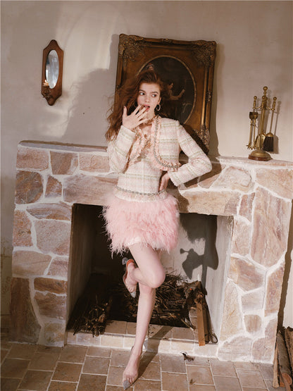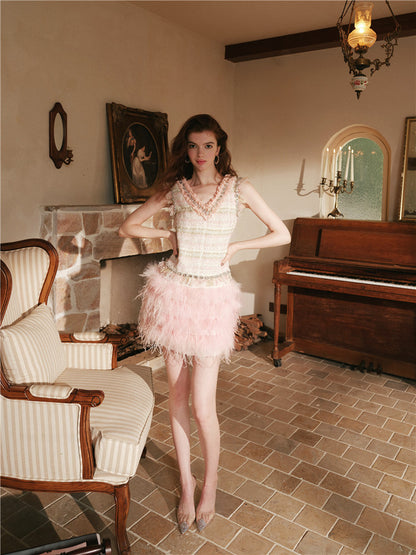 Introducing Chen Luxury's Wardrobes - the epitome of elegance, chic, and glamour. This pink sleeveless dress boasts feathers and tassels, accented with a stunning diamond design. Perfect for dressing to impress, this dress will elevate any occasion to a luxurious event.