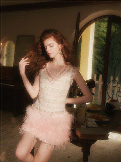 Wardrobes by Chen Luxury Pink Sleeveless Feather Tassel Diamond Dress-Eve