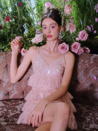Wardrobes by Chen Luxury Pink Sleeveless Sequin layer ruffle short Dinner Dress- Shaiko