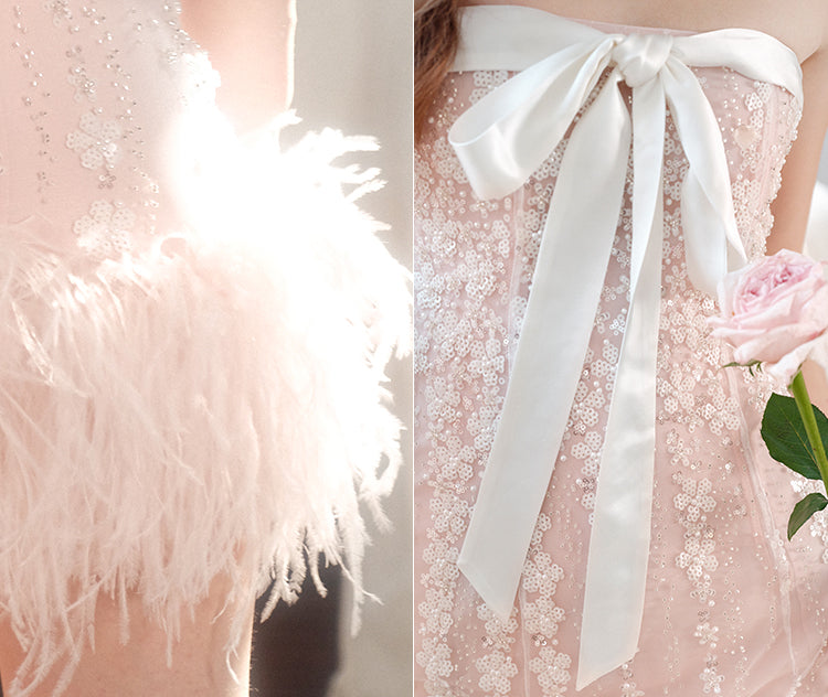 Indulge in luxury with our Wardrobes by Chen Pink Strapless Chest Wrap Ribbon Feather Dress-Zera. This elegant and chic piece will elevate your wardrobe with its sophisticated design and intricate details. Perfect for a special occasion, it will make you feel exclusive and timeless.