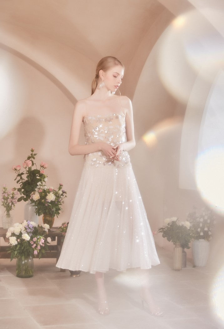 Wardrobes by Chen Luxury Strap Beaded Sequin Pleat Long Hem Top-Hioppi