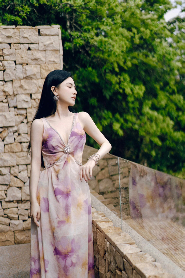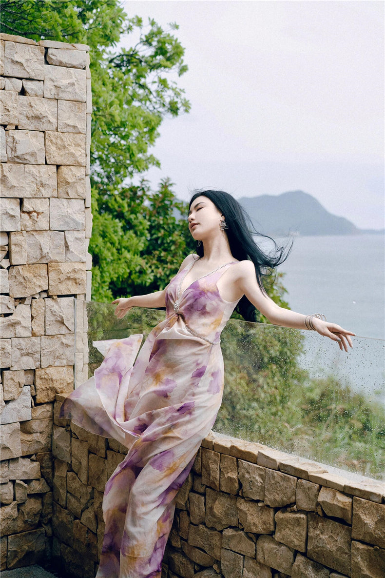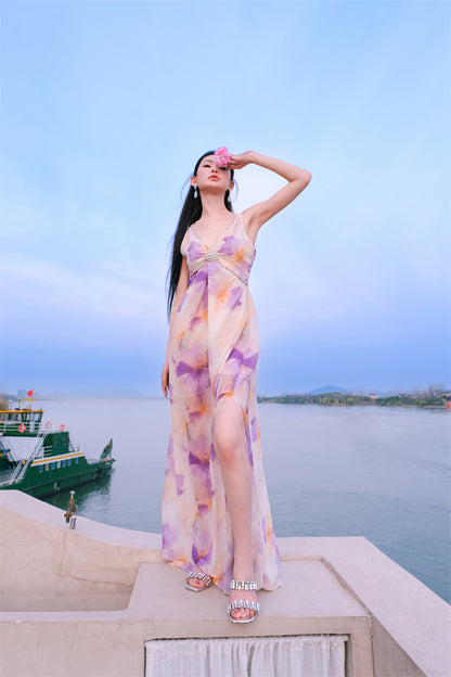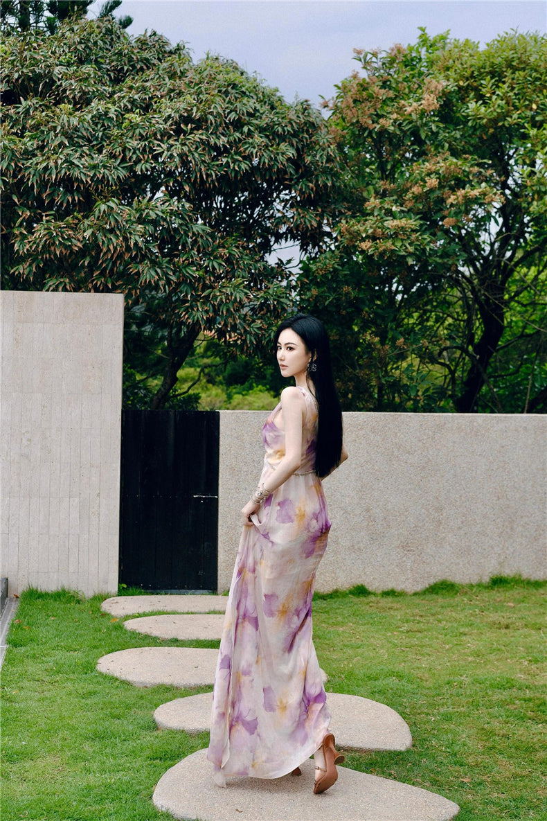 Wardrobes by Chen Luxury V-Neck Sleeveless Oil Painting Slit Long Resort Dress-May