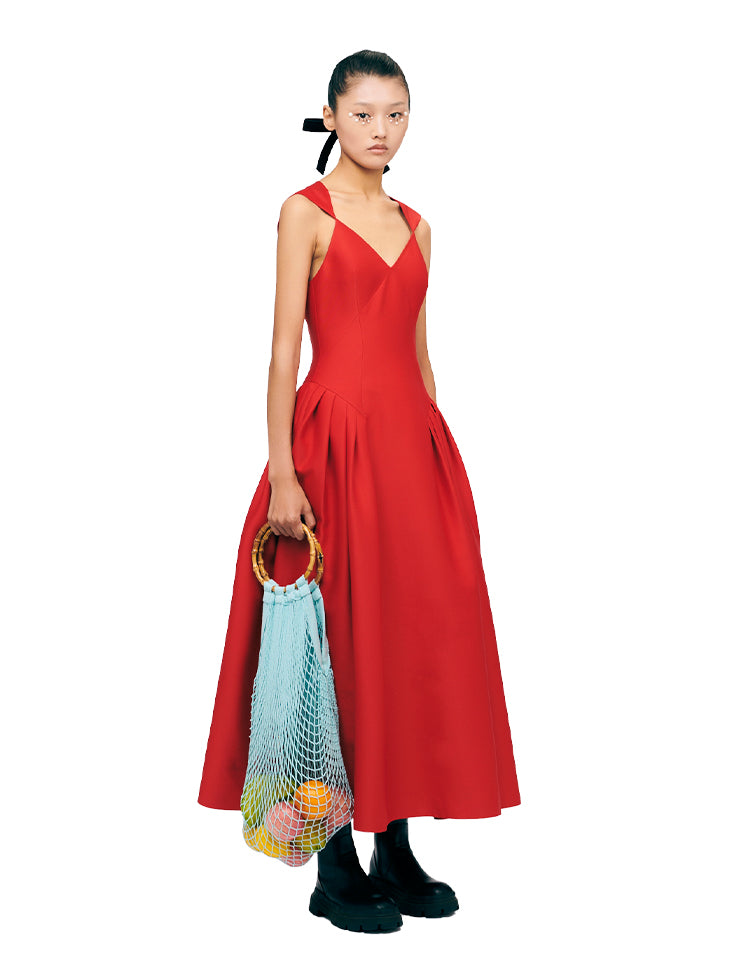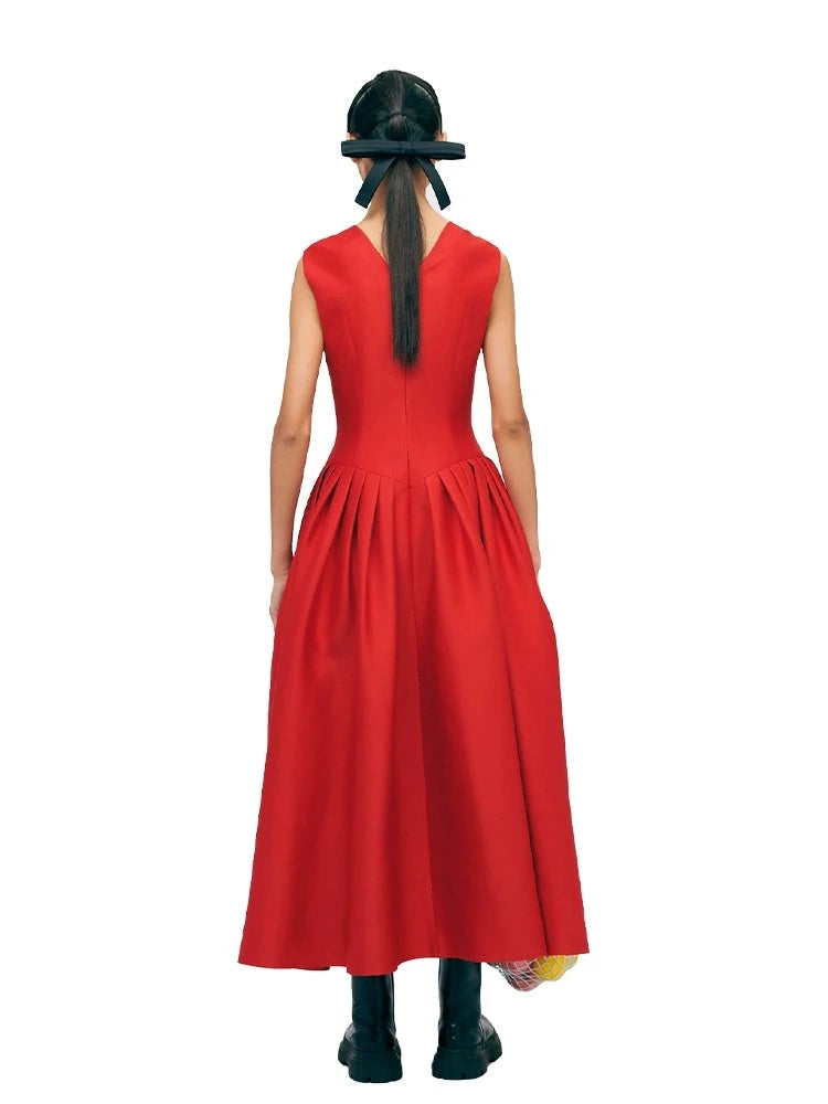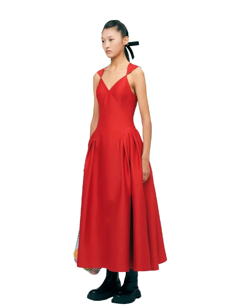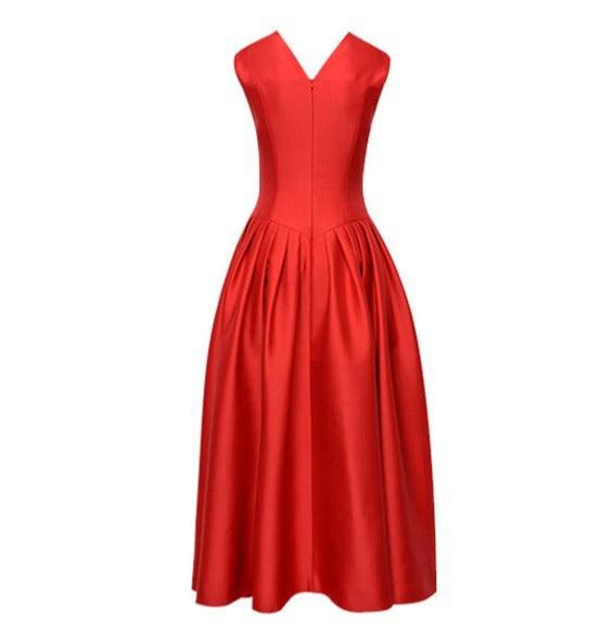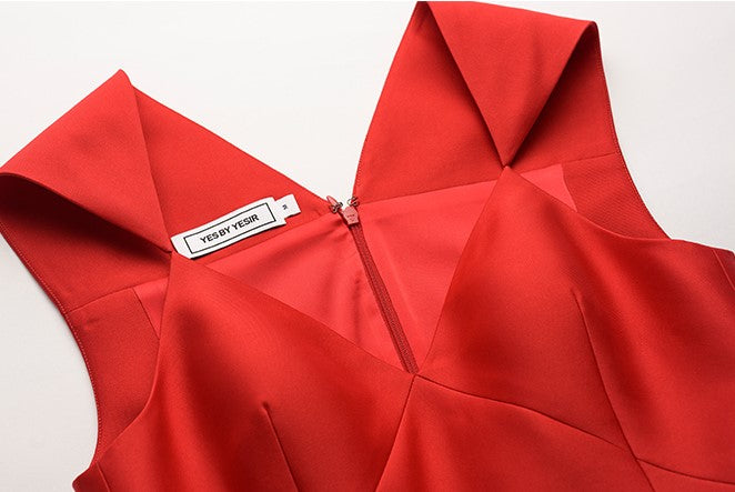 Introducing YES BY YESIR's pressed pleats sexy elegant red evening formal dress. An essential for discerning tastes, this luxuriously sophisticated and chic dress in a beautiful red hue is a timelessly gorgeous piece perfect for any formal event, from weddings to dinners or church. With a sleeveless, mid-length form and deep v-neck and high waist details, this swanky and fashionable outfit exudes timeless class and elegant finesse.