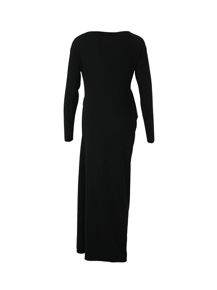 This slim, long knitted dress crafted from black sheep wool combines simplicity with elegance, offering a refined silhouette that enhances comfort and warmth. Its minimalist design makes it versatile for various occasions, providing both style and practicality for cooler seasons. Perfect for those seeking timeless sophistication in their wardrobe.