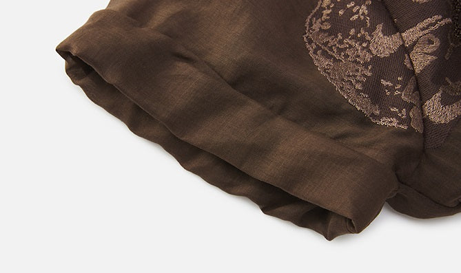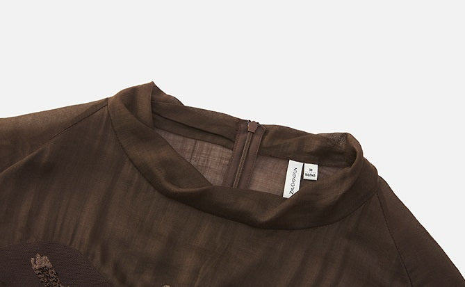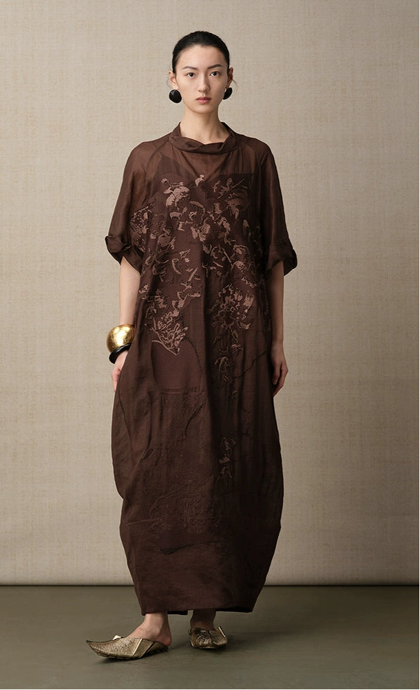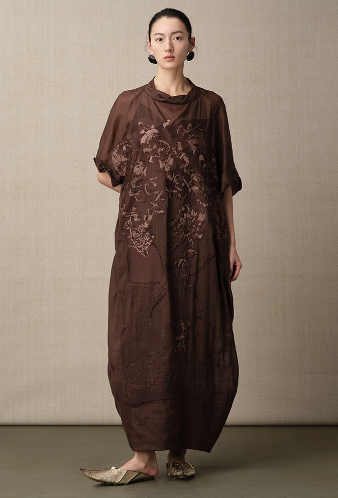 This summer dress combines lightweight, sheer fabric with a loose silhouette for optimal breathability and comfort on warm days. Its curled cuffs add a refined detail to the short sleeves, enhancing both style and movement. Ideal for staying cool without sacrificing elegance, this dress balances airy design with sophisticated finishing touches for a polished summer look.