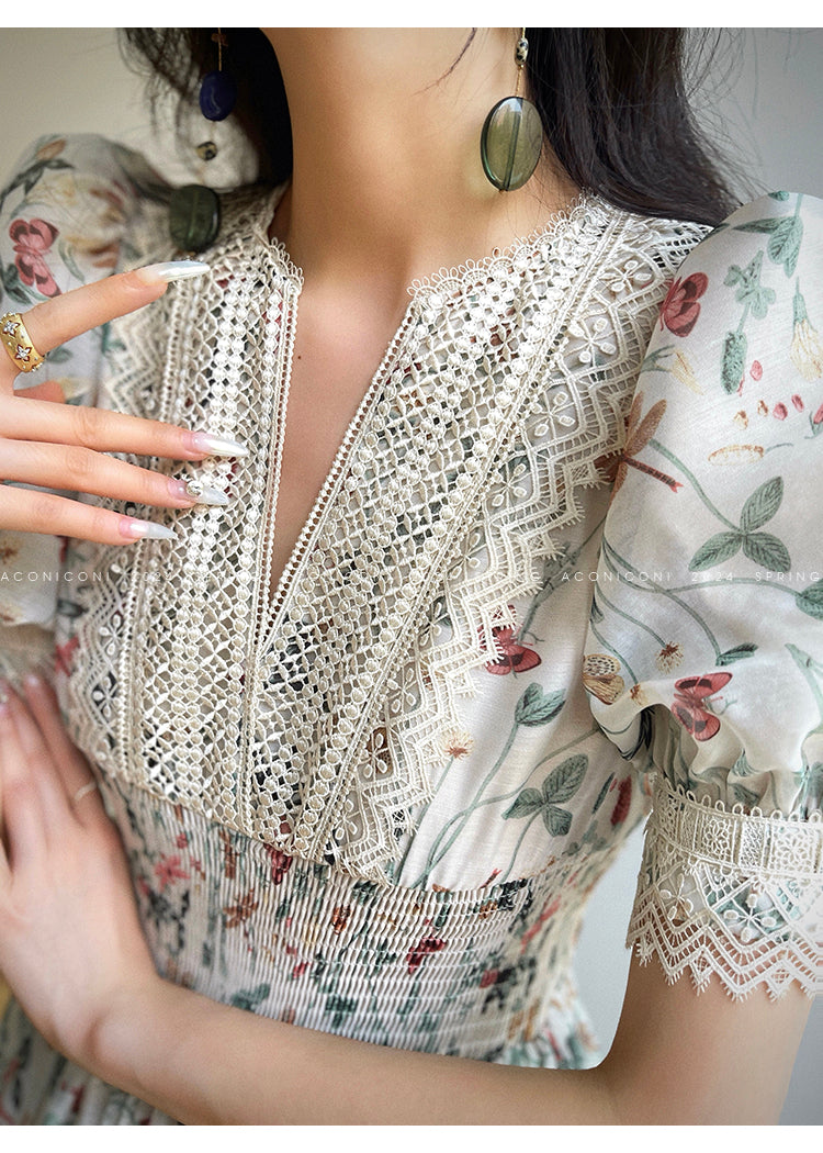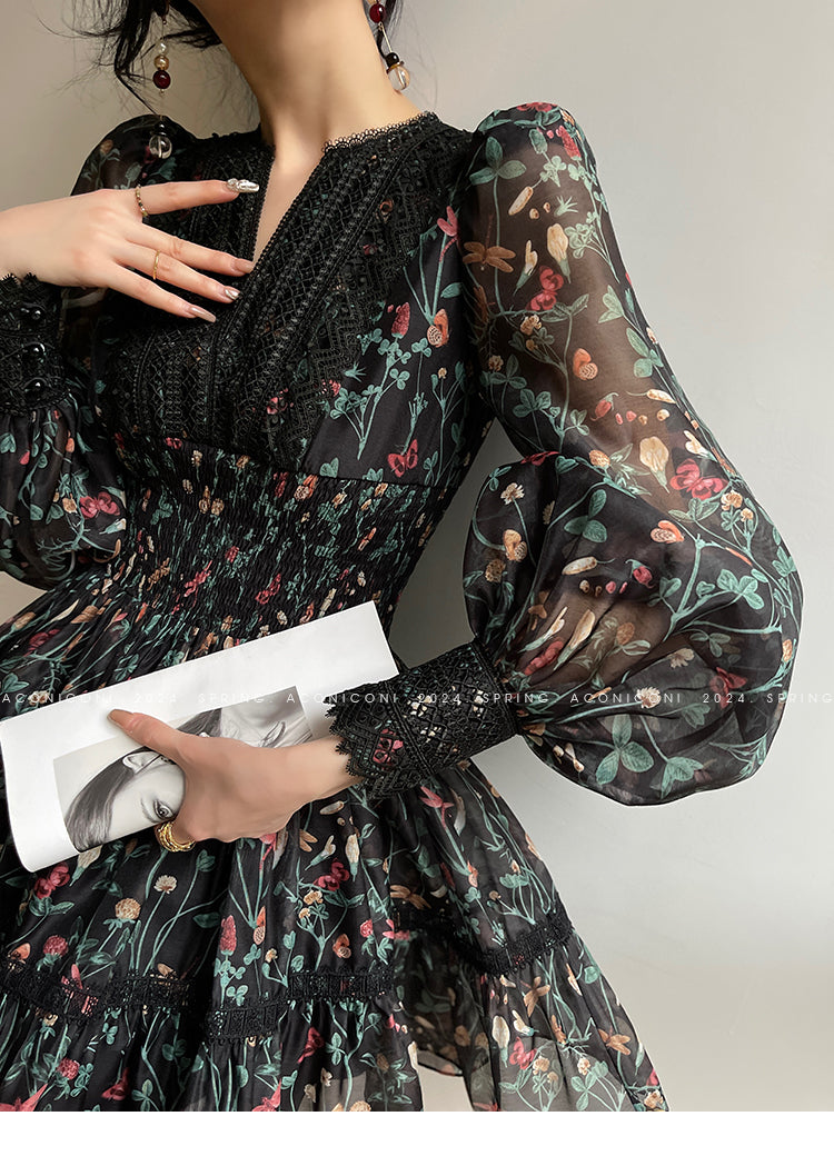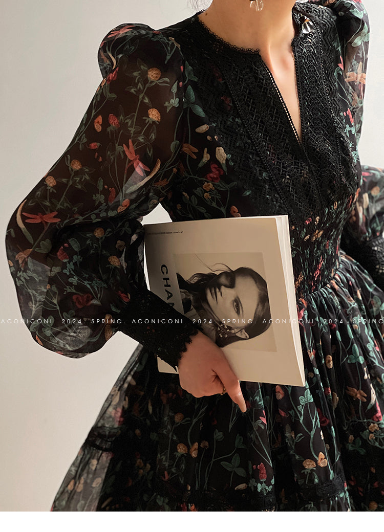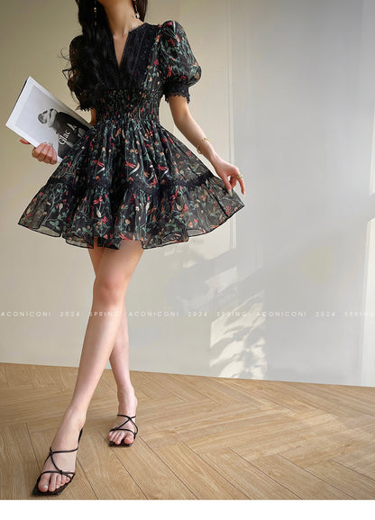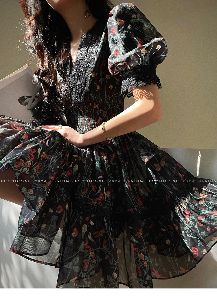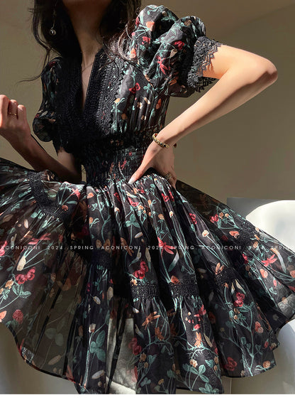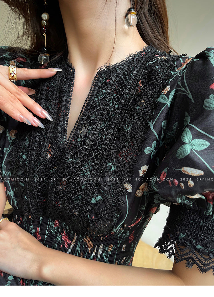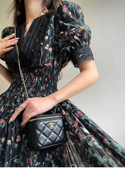 Aconiconi Elegant French Print Retro V-Neck Lace Tea Dress- Night Rose