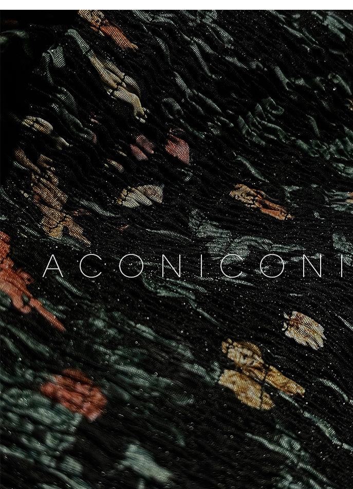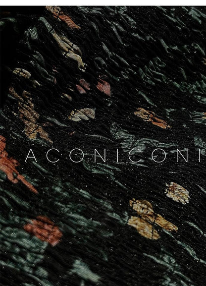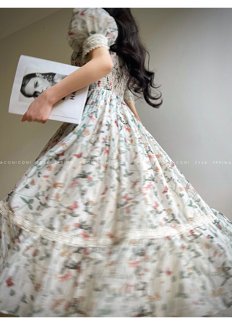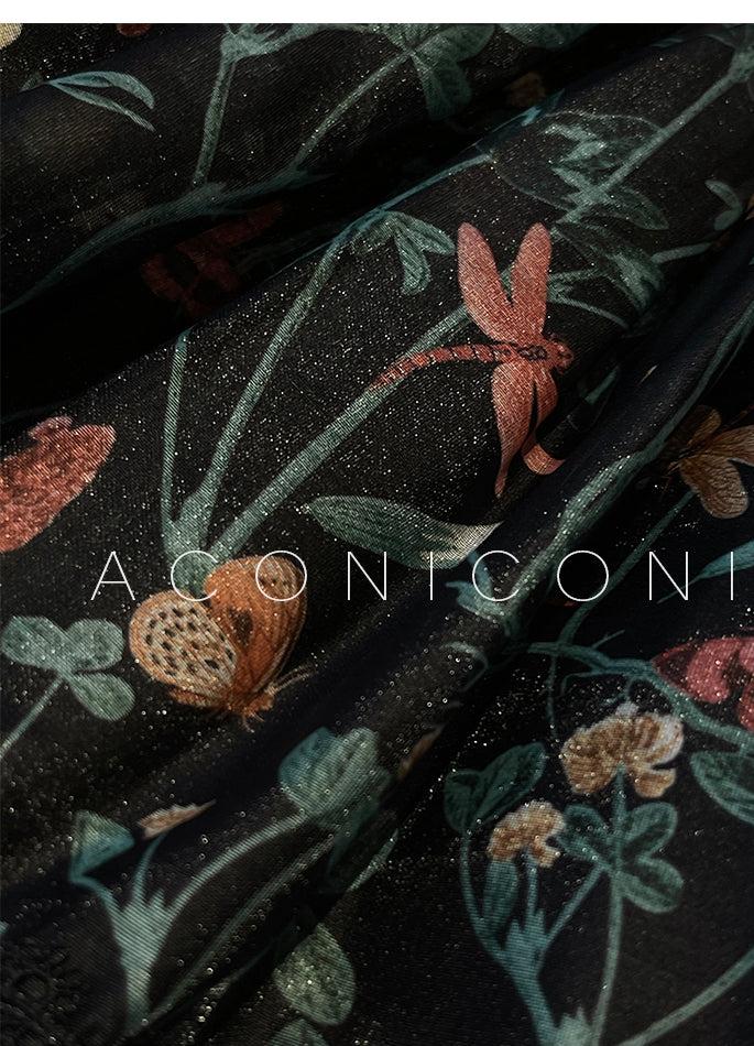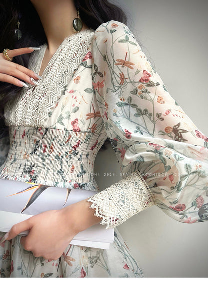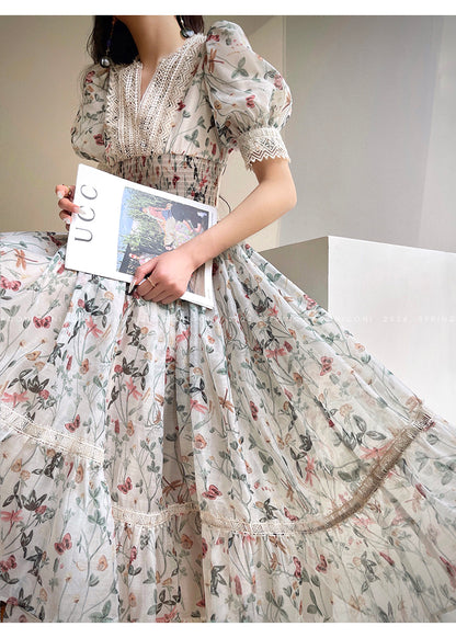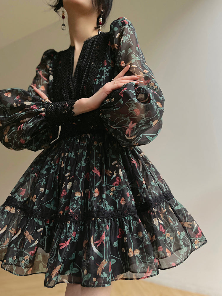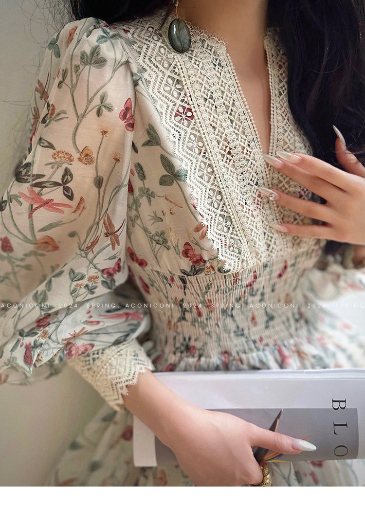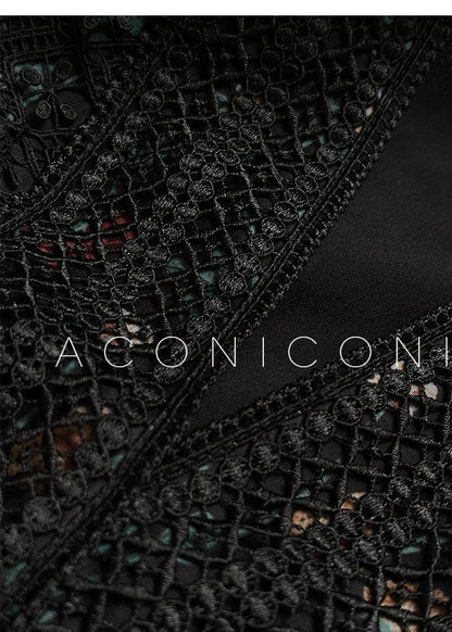 Aconiconi Elegant French Print Retro V-Neck Lace Tea Dress- Night Rose