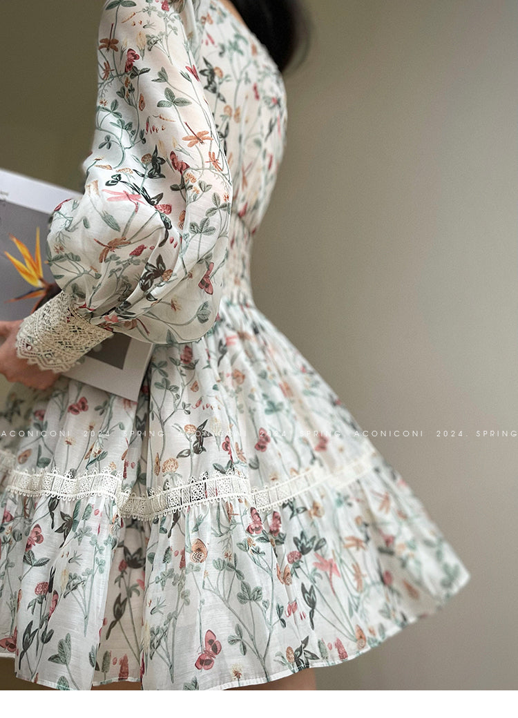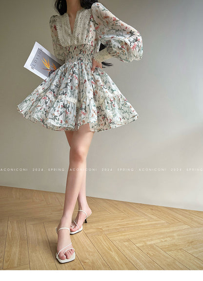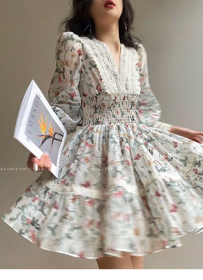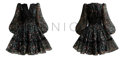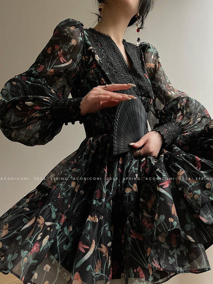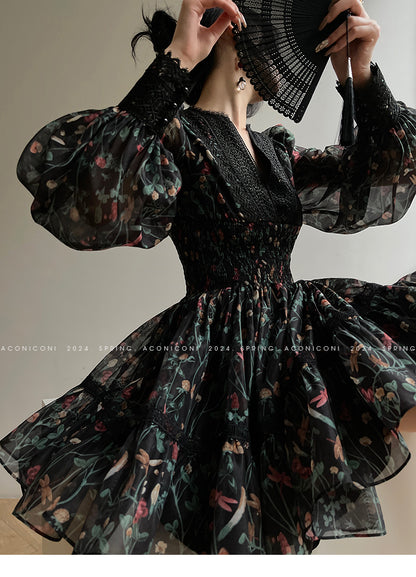 Introducing our Aconiconi Elegant Black French Print Retro V-Neck Long Sleeve Short Lace Tea Dress-Toria. This gorgeous and dashing dress exudes sophistication and flamboyance. With its elegant v-neck, long sleeve, and short lace design, it's the perfect outfit for a hangout or a picnic. Its simple yet trendy style makes it a must-have for any wardrobe. Elevate your look with this stunning French-inspired tea dress.