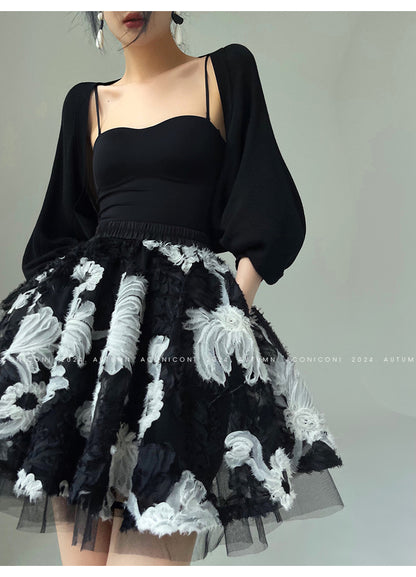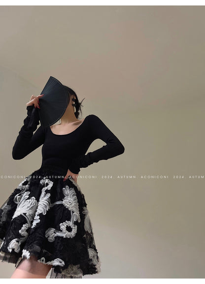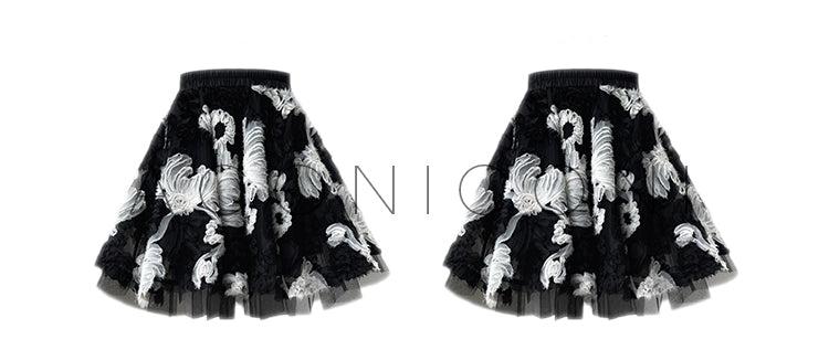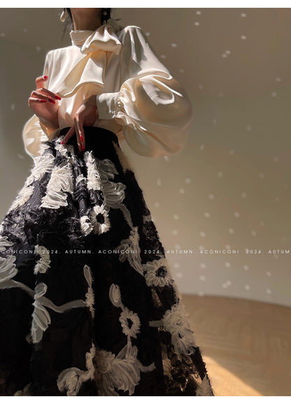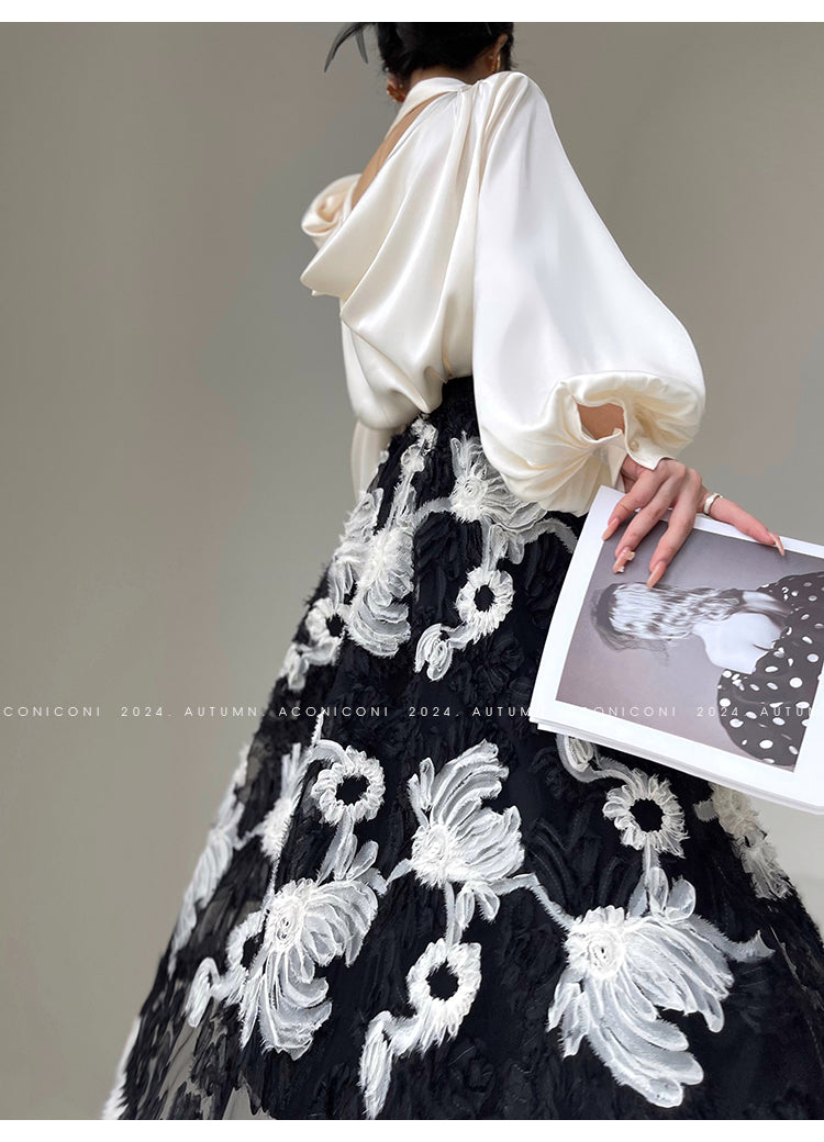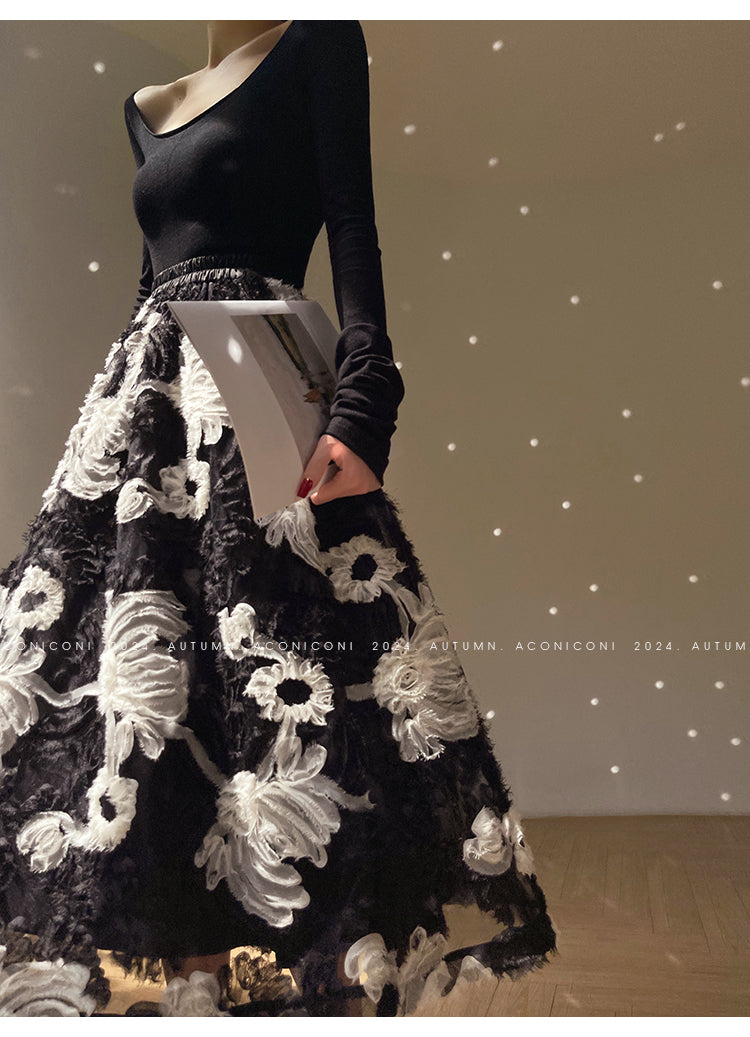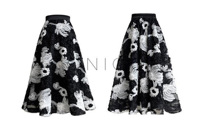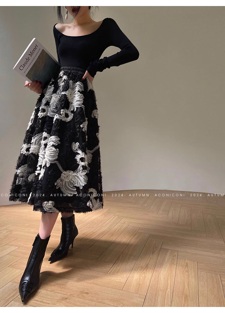 Aconiconi Elegant Black Retro Flower Embroidered High Waist Midi Skirt- Cedar Late Forest