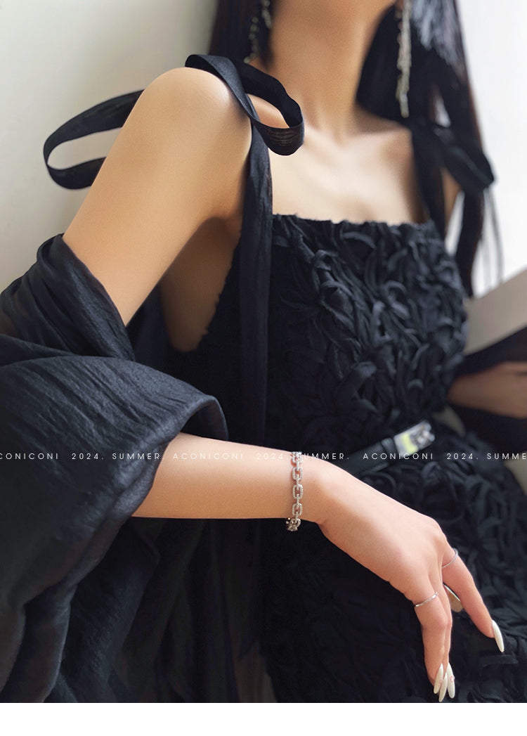 Indulge in sophistication with the Aconiconi Elegant Black Retro Sleeveless Suspender Loose Dinner Dress- Quiet Night Orchid. With its unique style and exquisite design, this elegant black dress is perfect for any occasion, from a lavish dinner to a chic autumn outing. Its chic and dashing design will make you feel sexy and mature, while its flamboyant and classy look will leave everyone speechless. Elevate your fashion game with this stylish and fashionable dress.