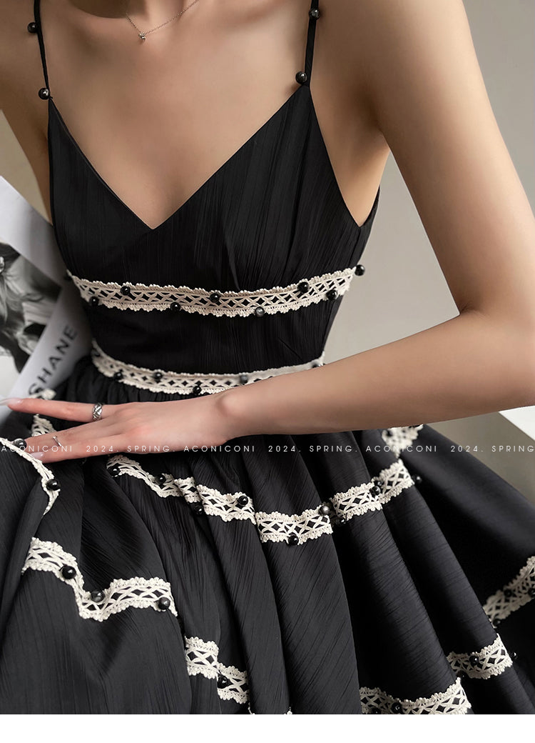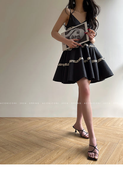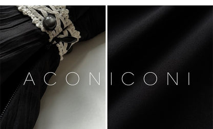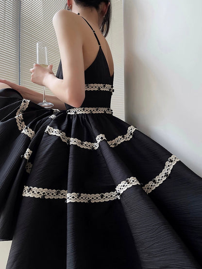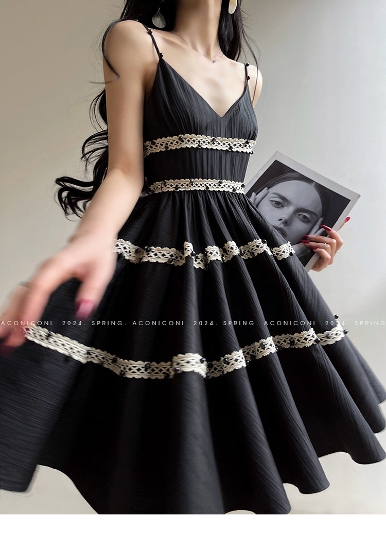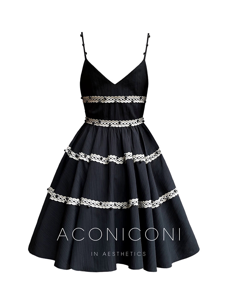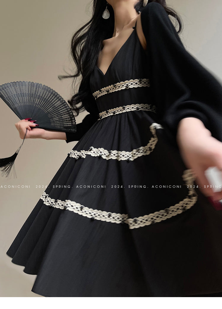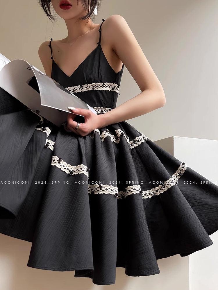 Aconiconi Elegant Black V-Neck Sleeveless Midi Tutu Chic Dress- Rainy Night in Paris