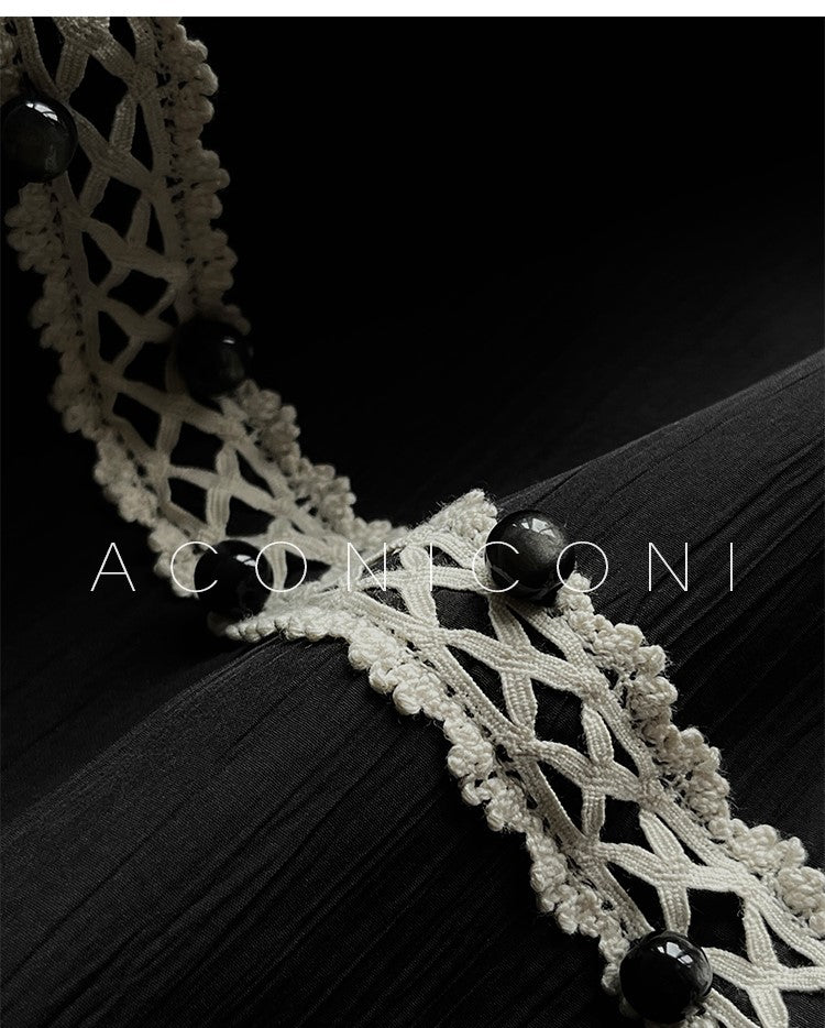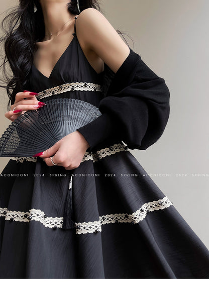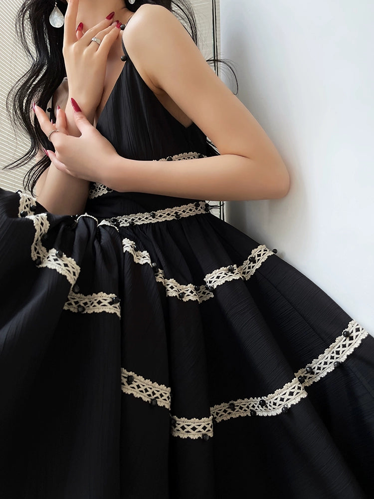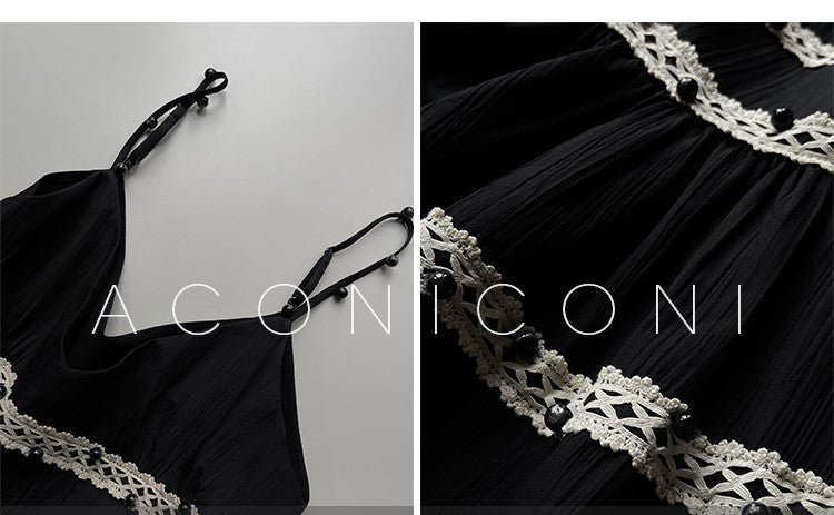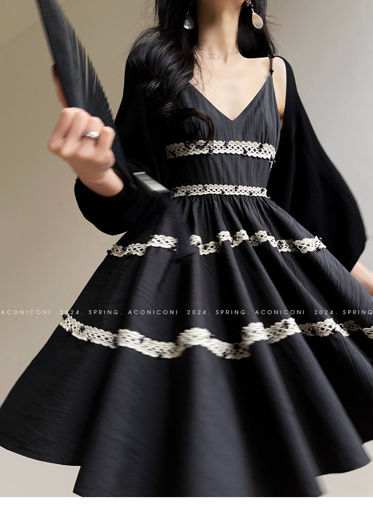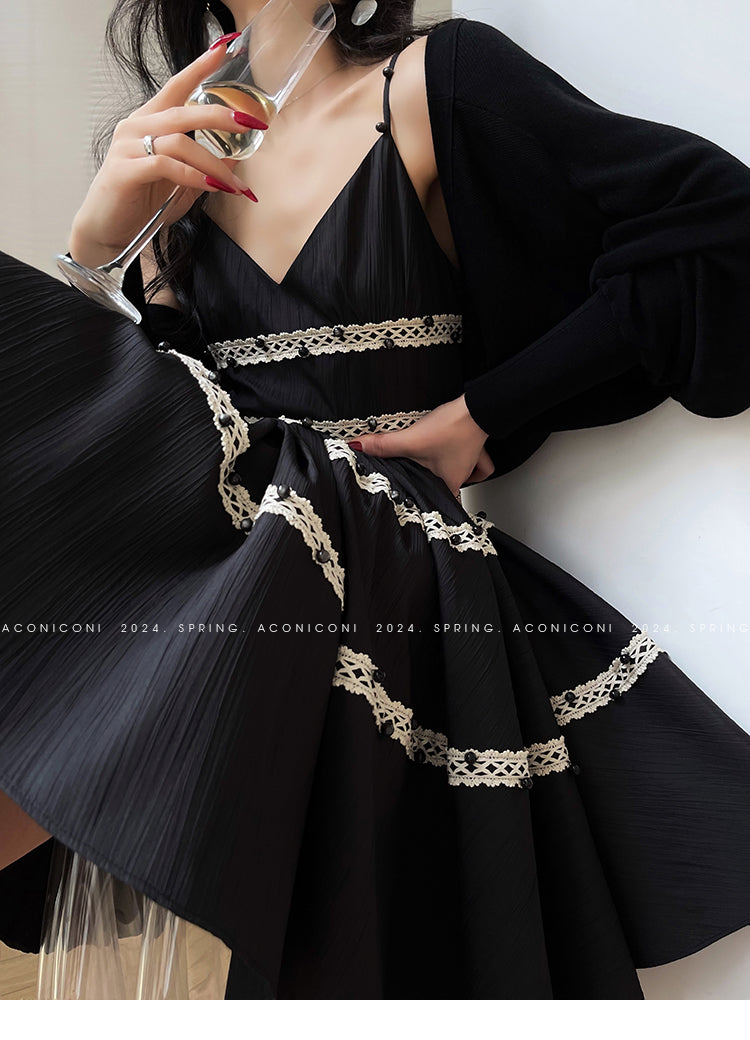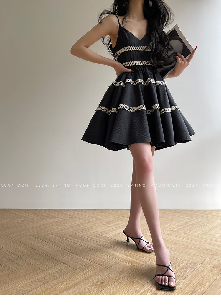 Aconiconi Elegant Black V-Neck Sleeveless Midi Tutu Chic Dress- Rainy Night in Paris