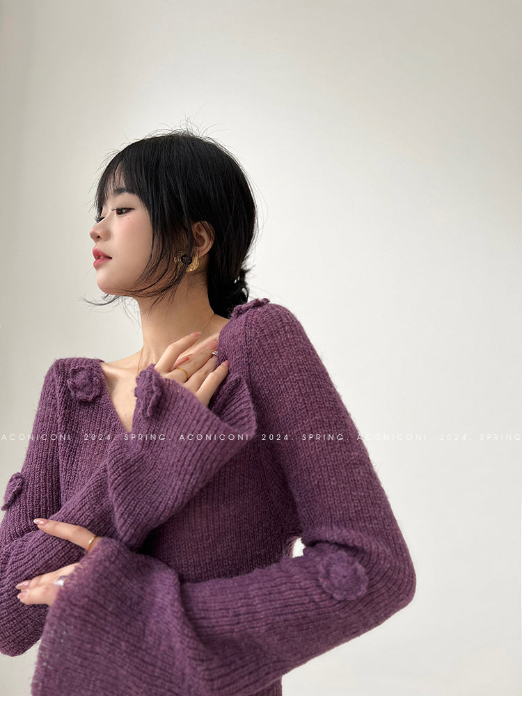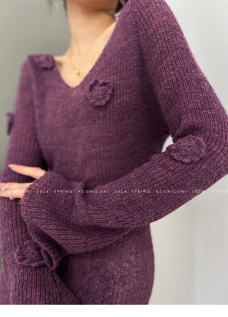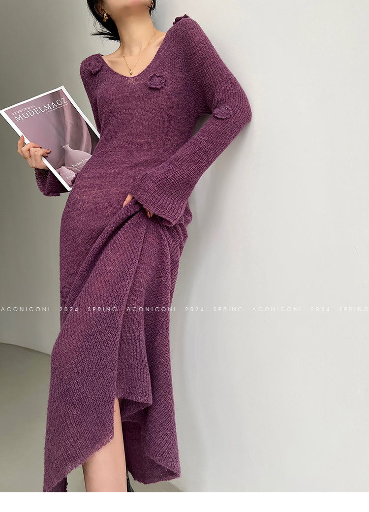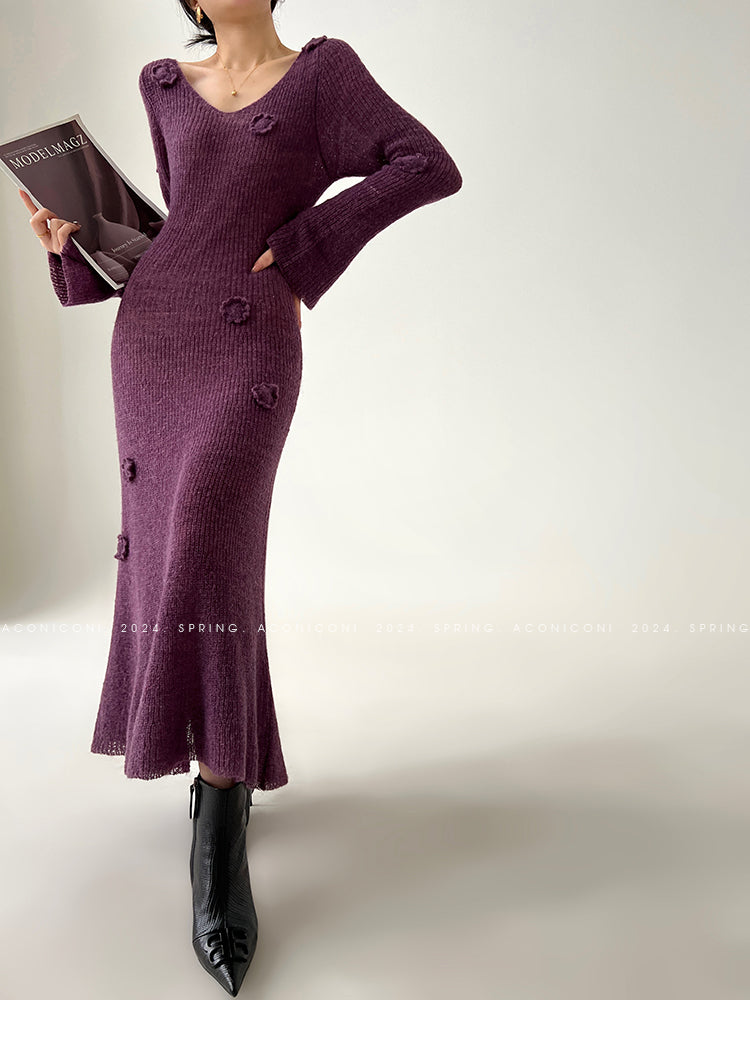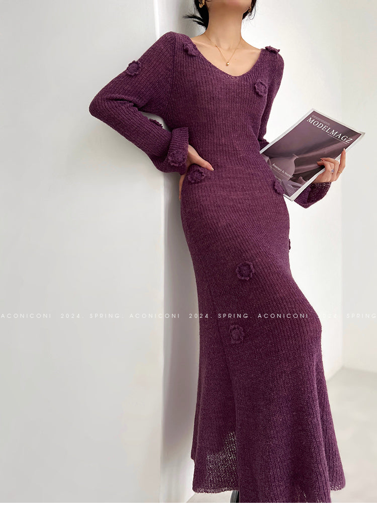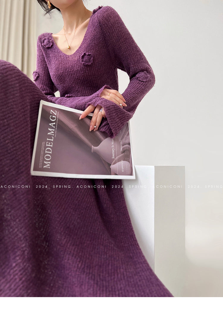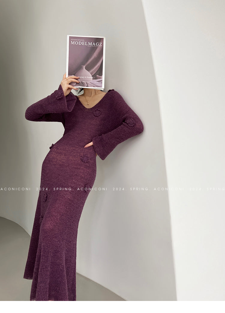 Indulge in luxury with our Aconiconi Elegant Deep Purple V-Neck Long Sleeve Long Knitted Dress-Queen. This chic and stylish dress boasts a deep purple hue, v-neckline, and long sleeves that exude elegance and sophistication. The knitted fabric adds a touch of coziness, making it perfect for fall and autumn. A must-have for any fashion-forward, classy lady.