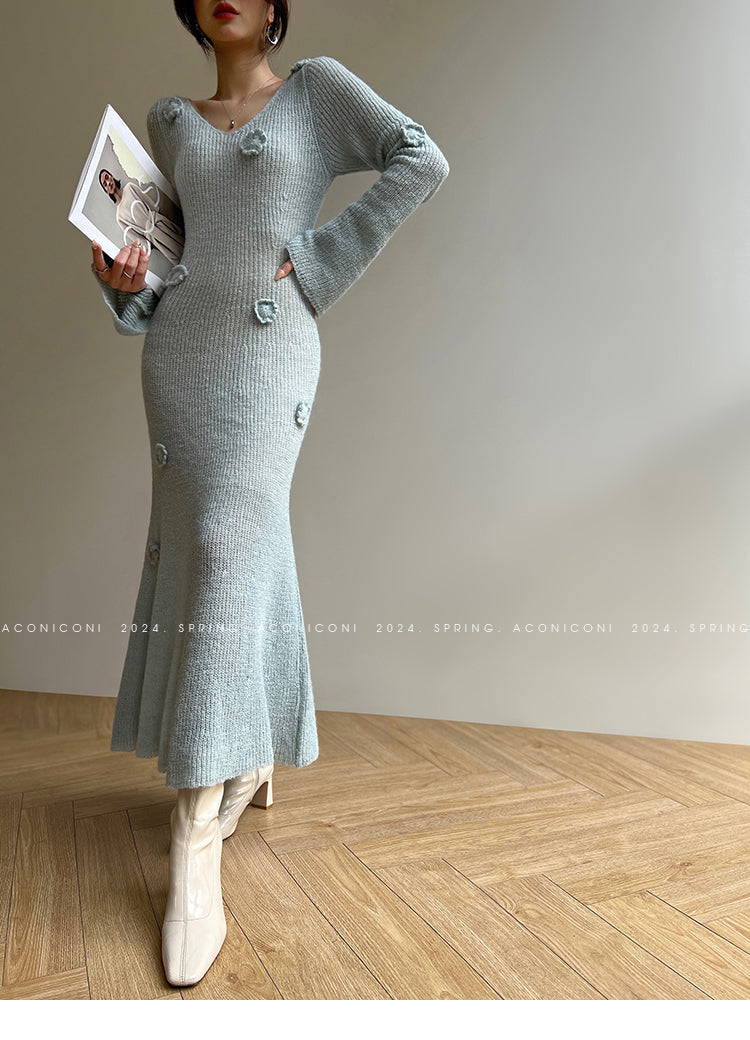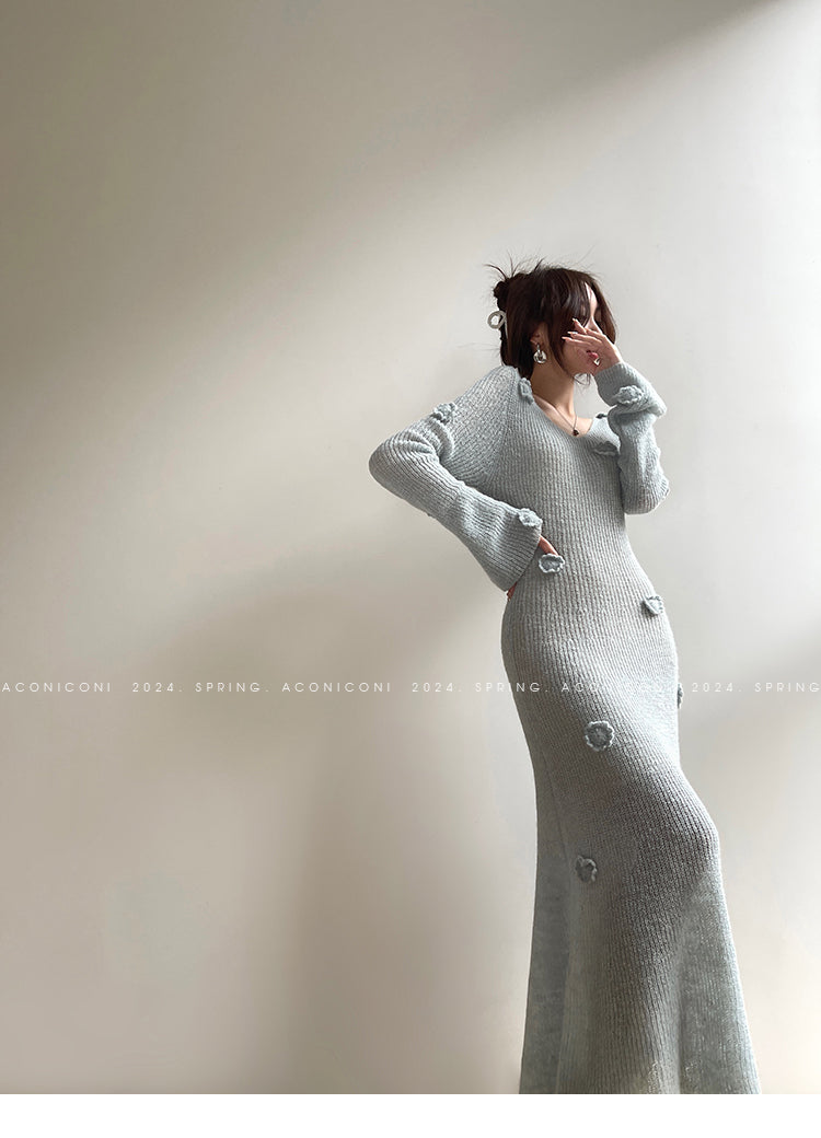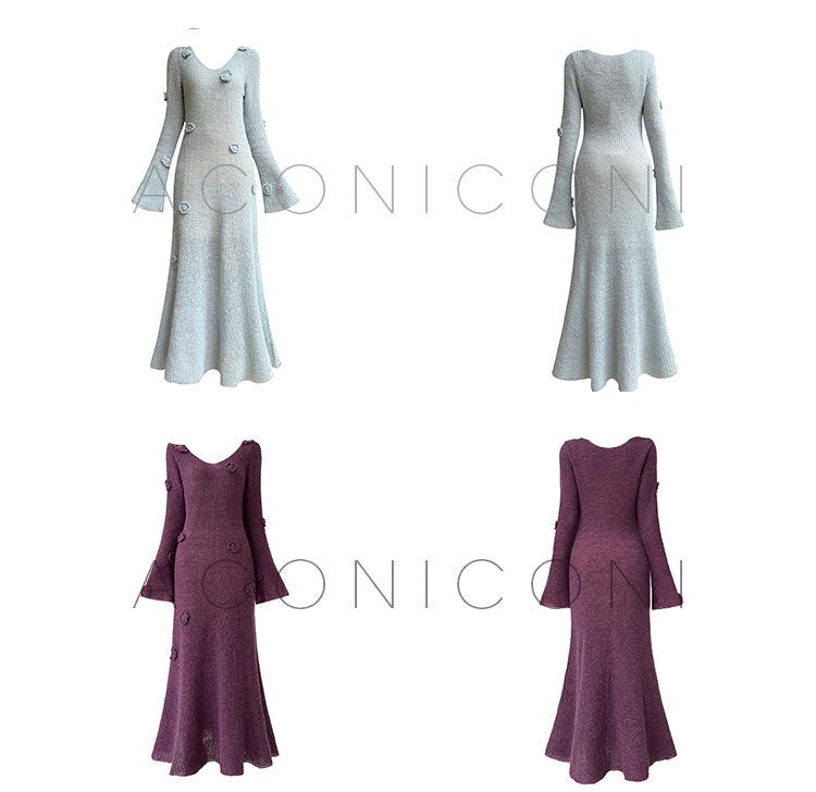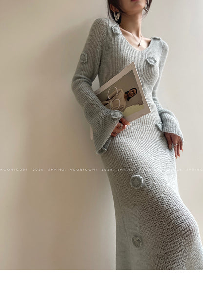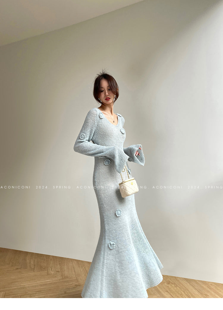 Aconiconi Elegant Long Sleeve Long Knitted Dress - Alocasia blue star