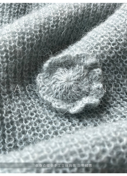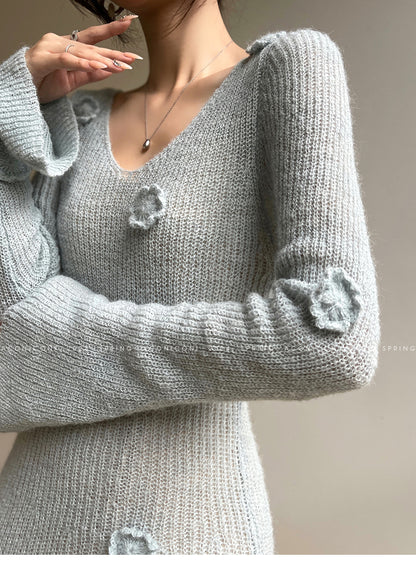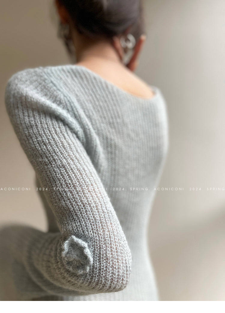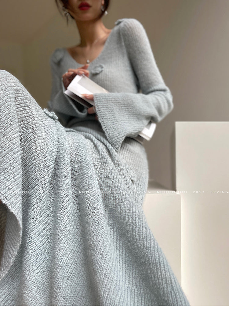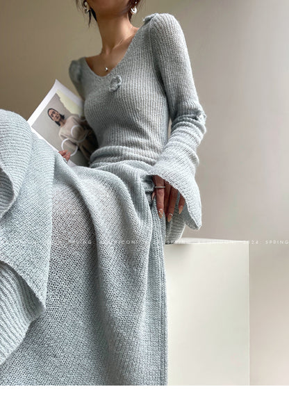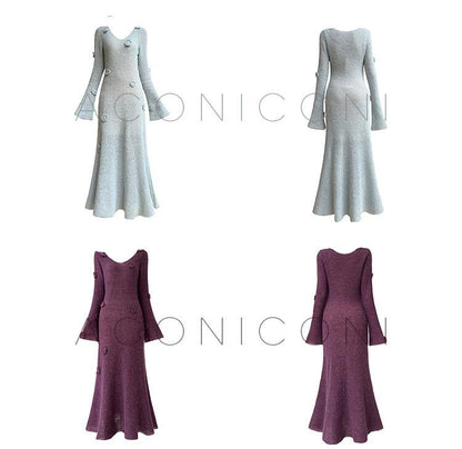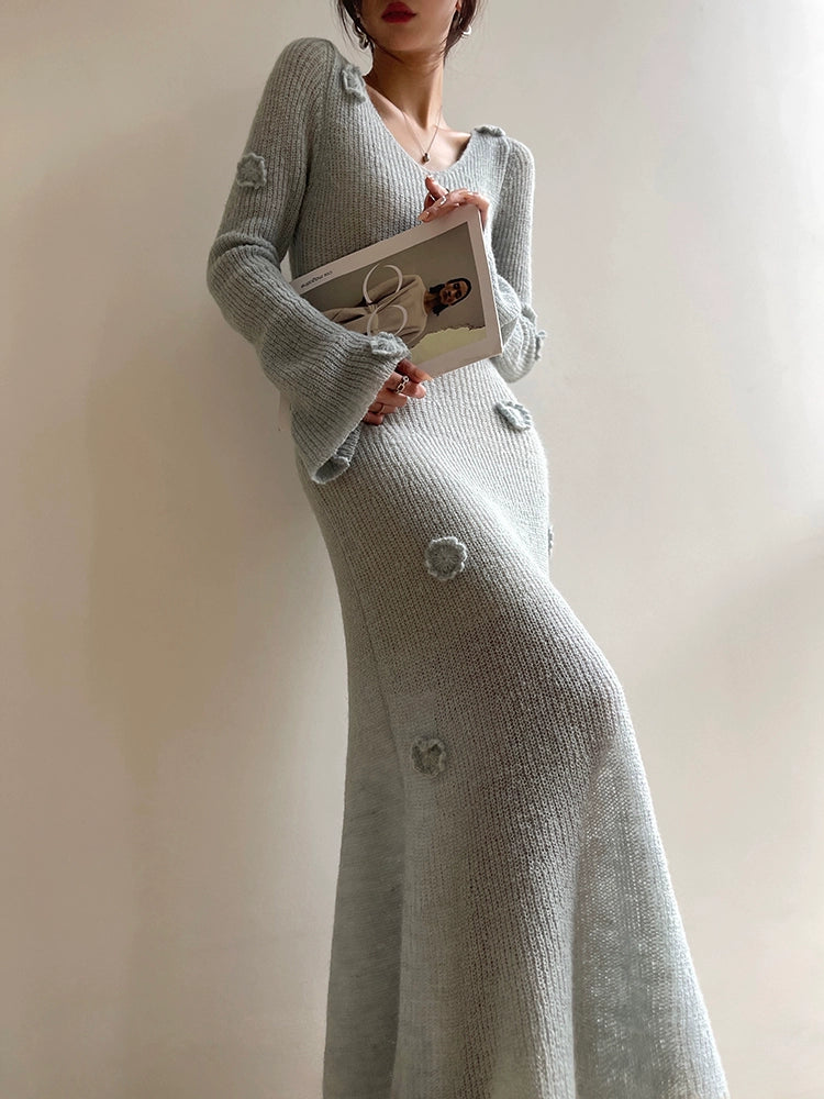 Aconiconi Elegant Long Sleeve Long Knitted Dress - Alocasia blue star